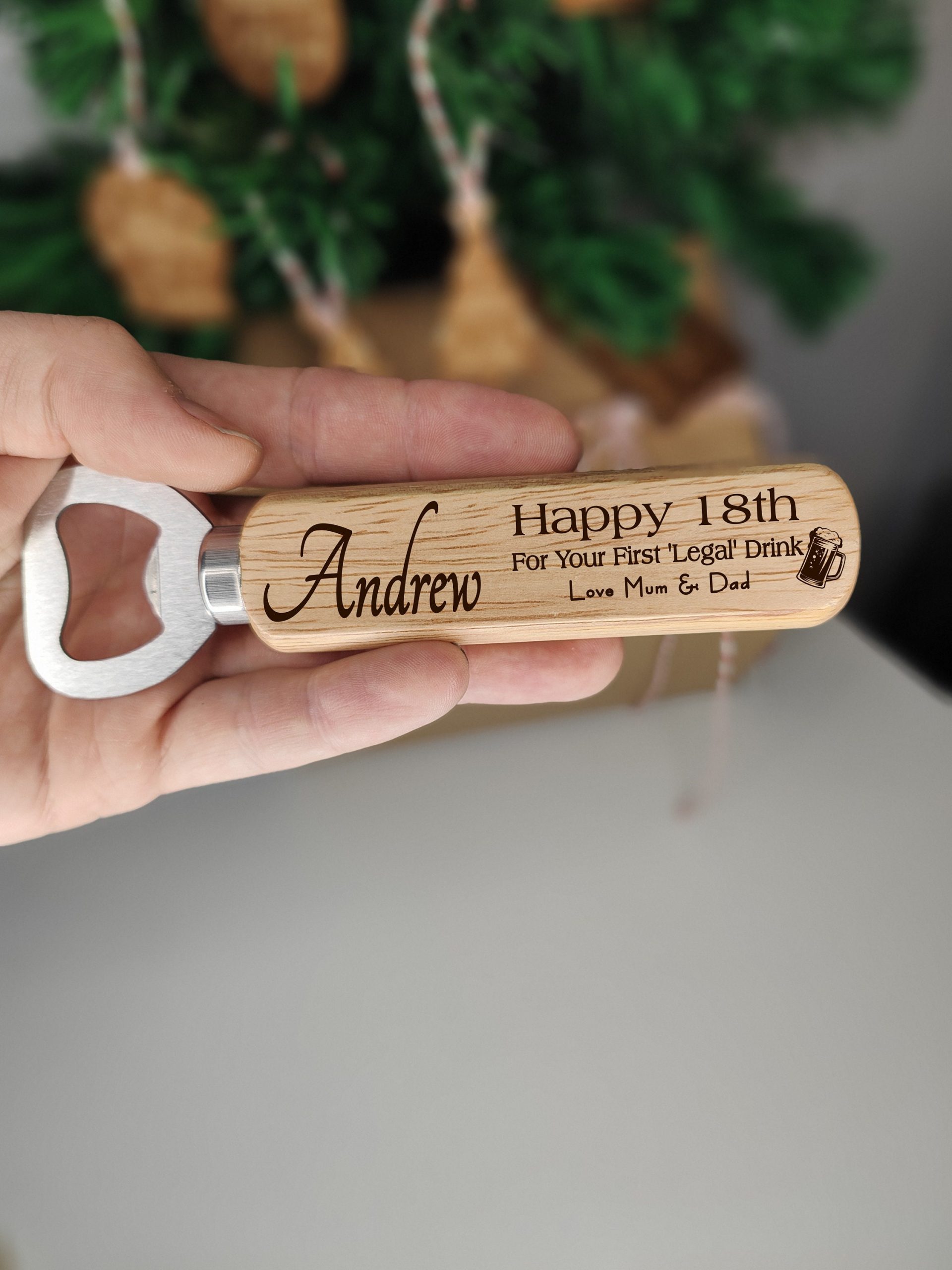 This cute wooden bottle opener is ideal for an 18th birthday gift, personalise it with the recipients name and for that extra special touch, the senders name too. We’ve designed this with a first legal drink in mind for an 18th but if you want a different age say 21st or 30th etc, or a different phrase, just drop us a message!
