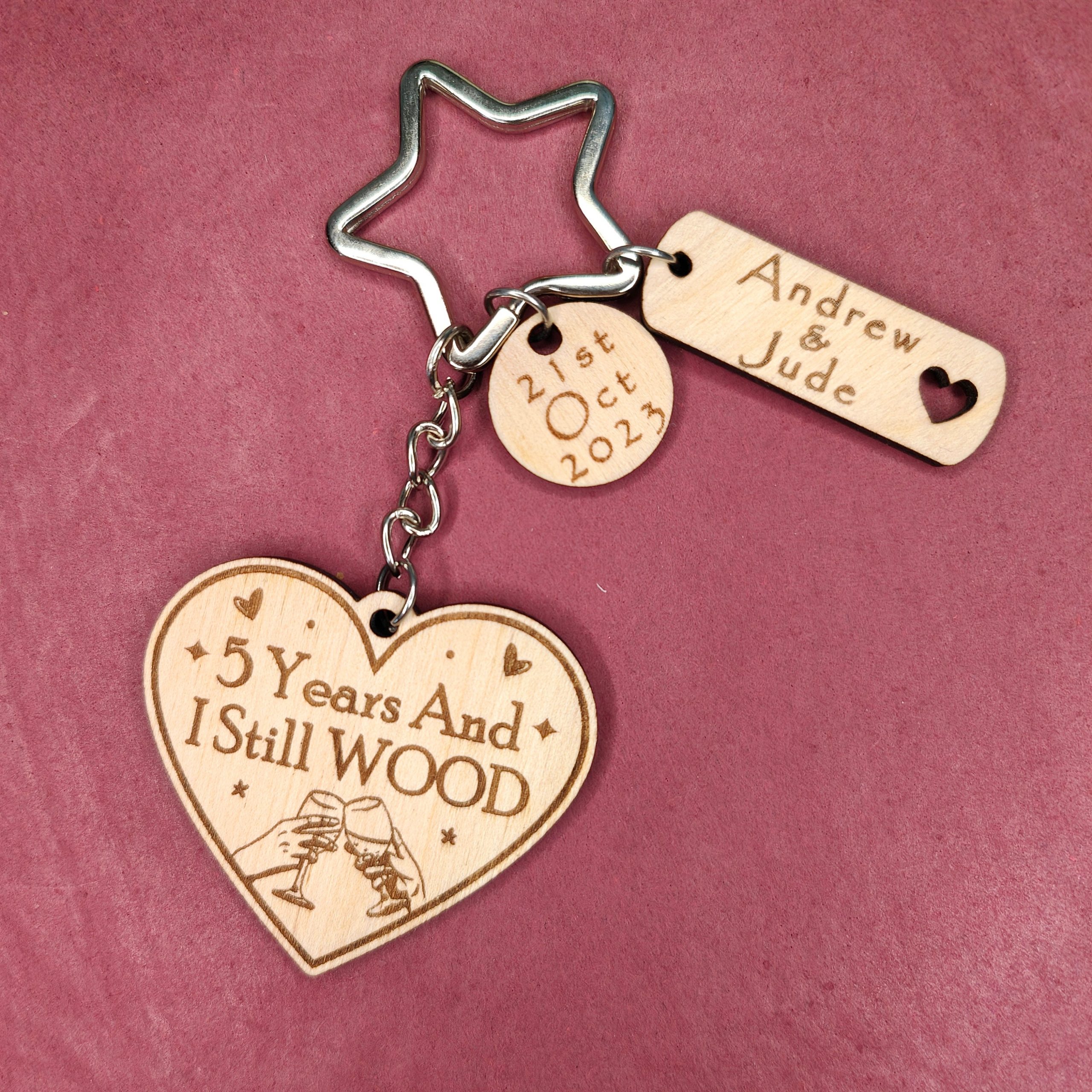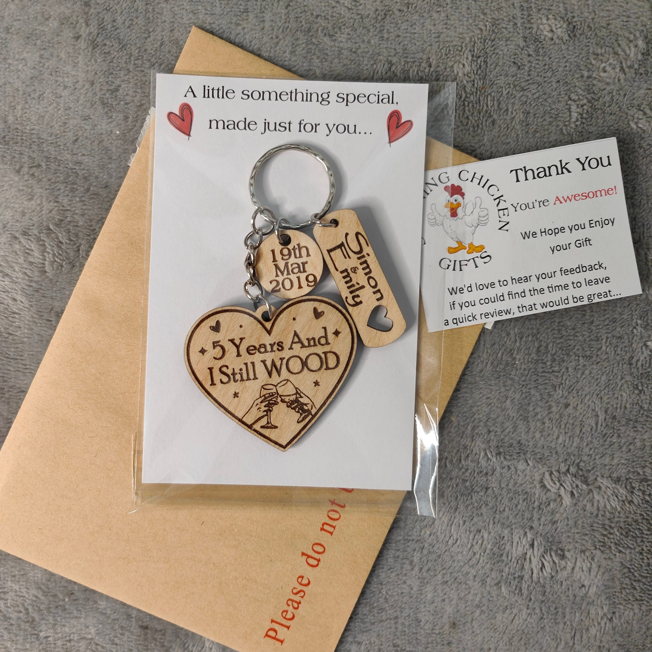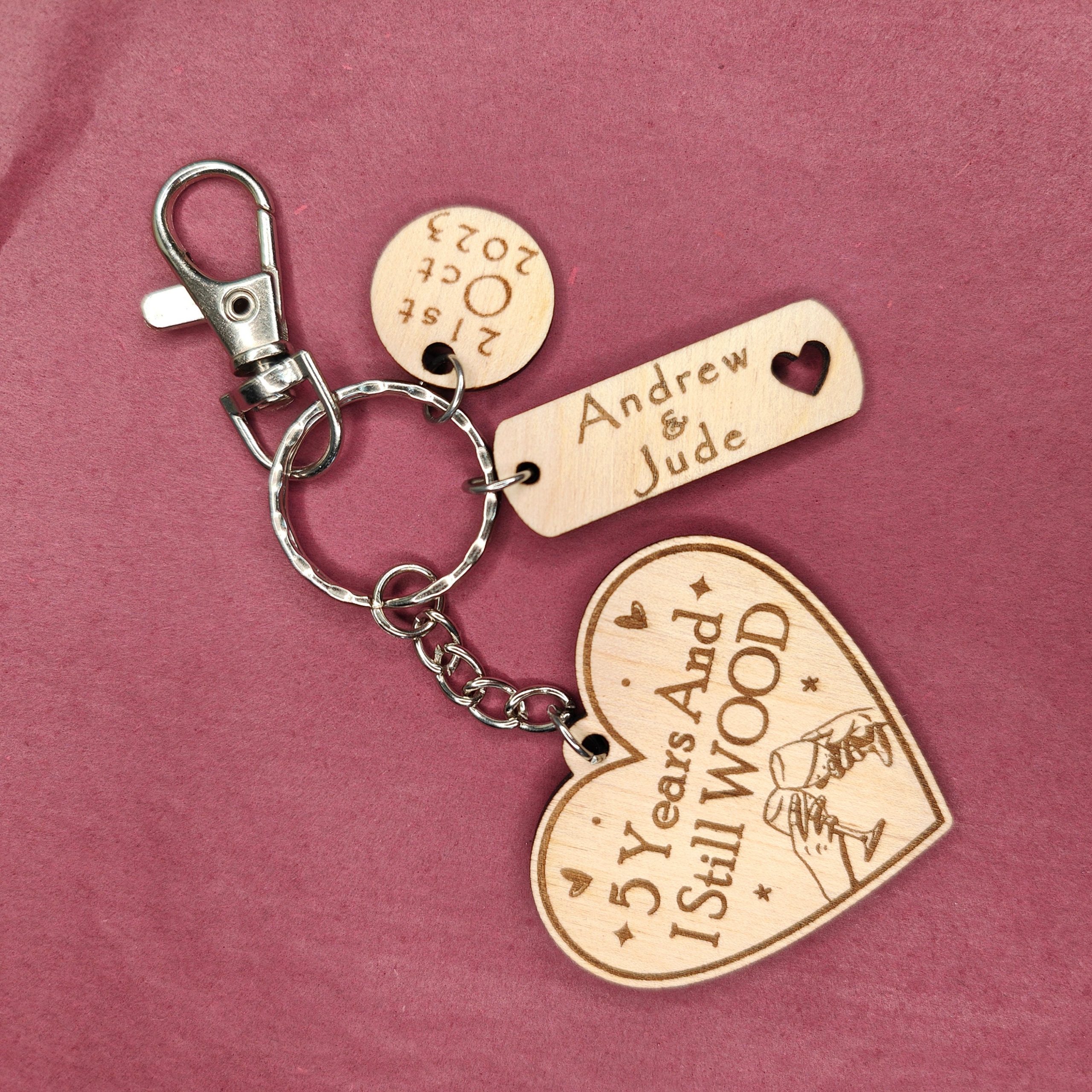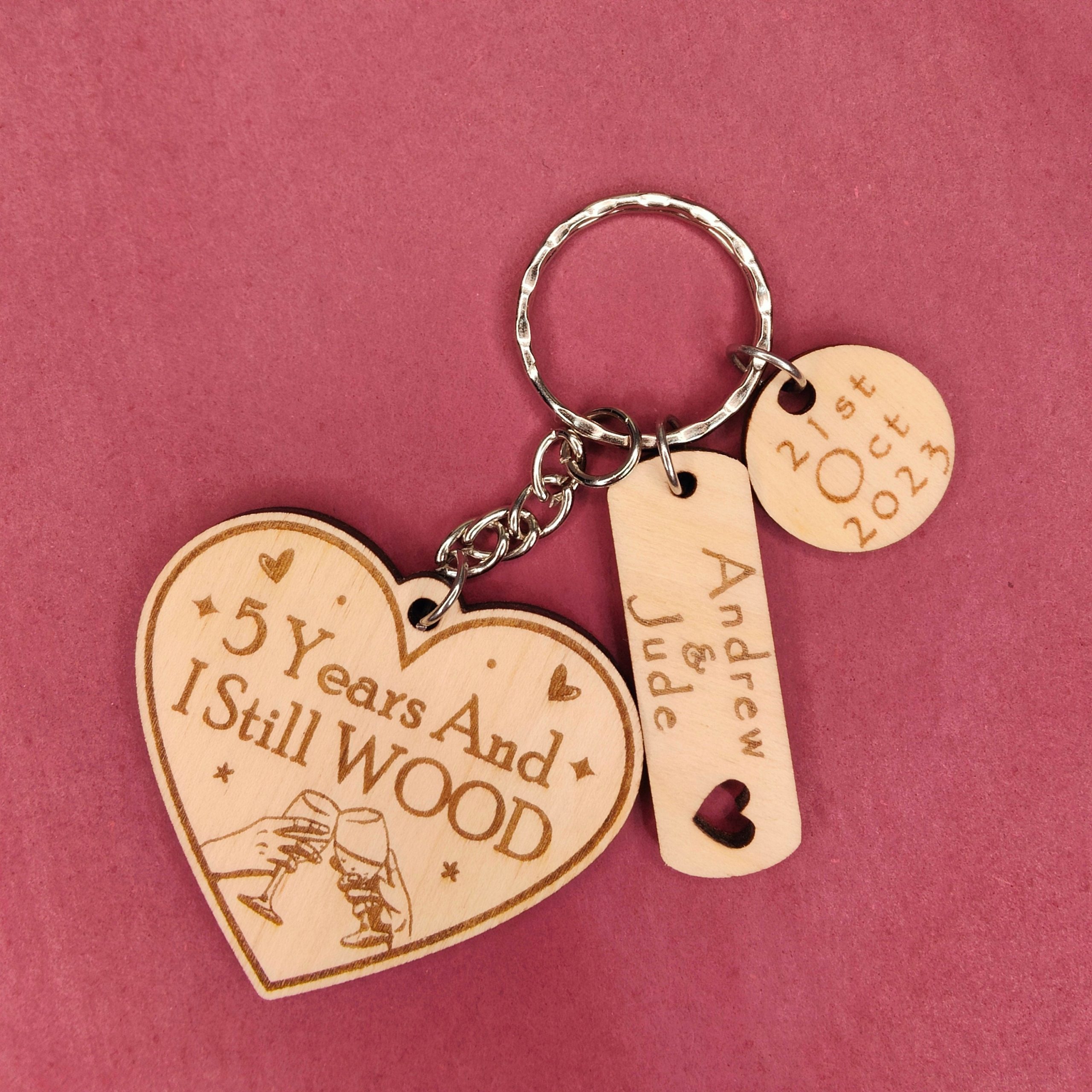 This adorable heart shaped keyring makes a fantastic Valentines gift or for those celebrating their 5 year wood anniversary or any other Anniversary. A little bit cheeky and funny, making it the perfect quirky little fun gift. Ideal for Boyfriends, Girlfriends, Husbands, Partners and Wives. This high quality wooden Keyring can be personalised with any Name & Date and number of years. Large enough not to lose, small enough to be comfy. Presented on White backed card in a clear protective pocket.