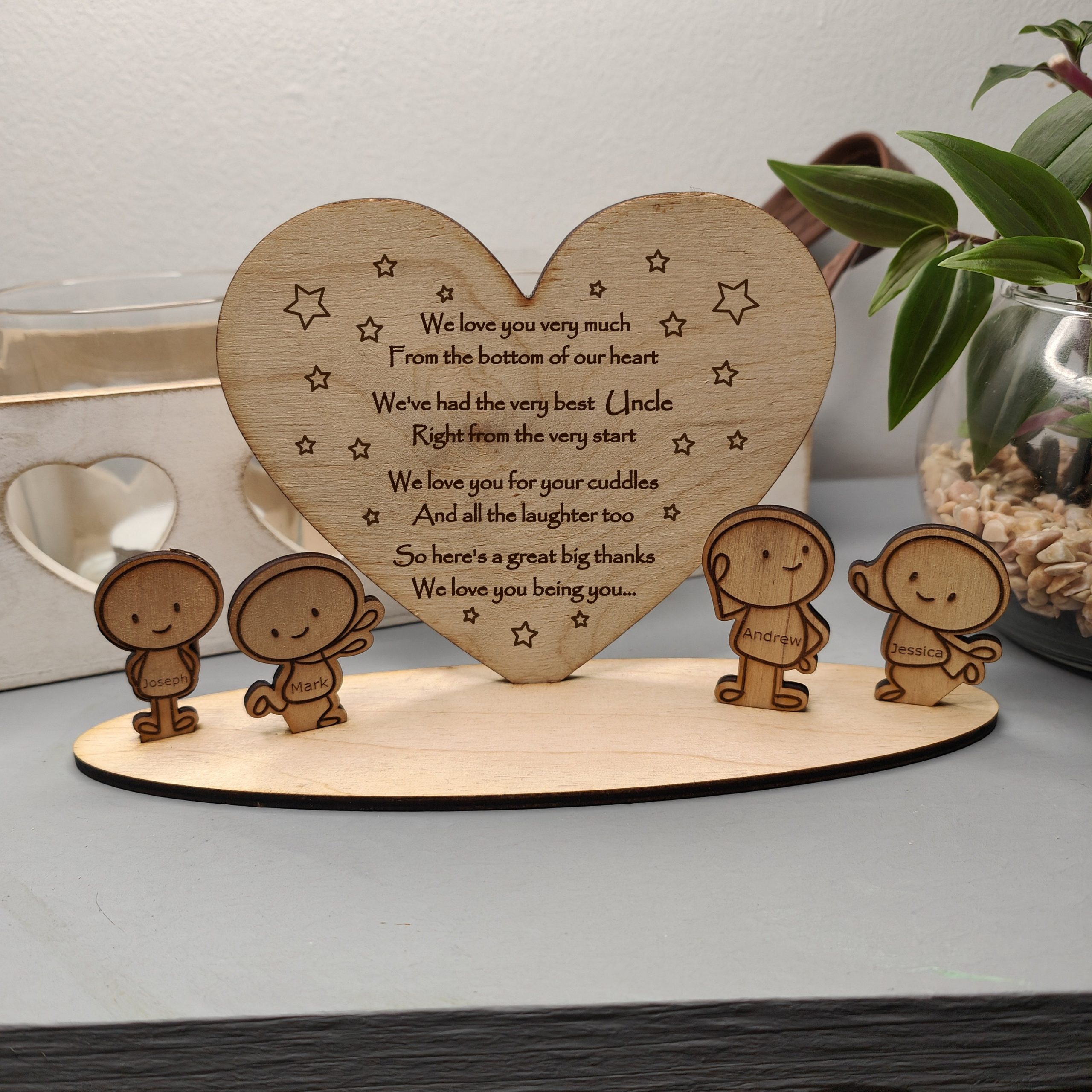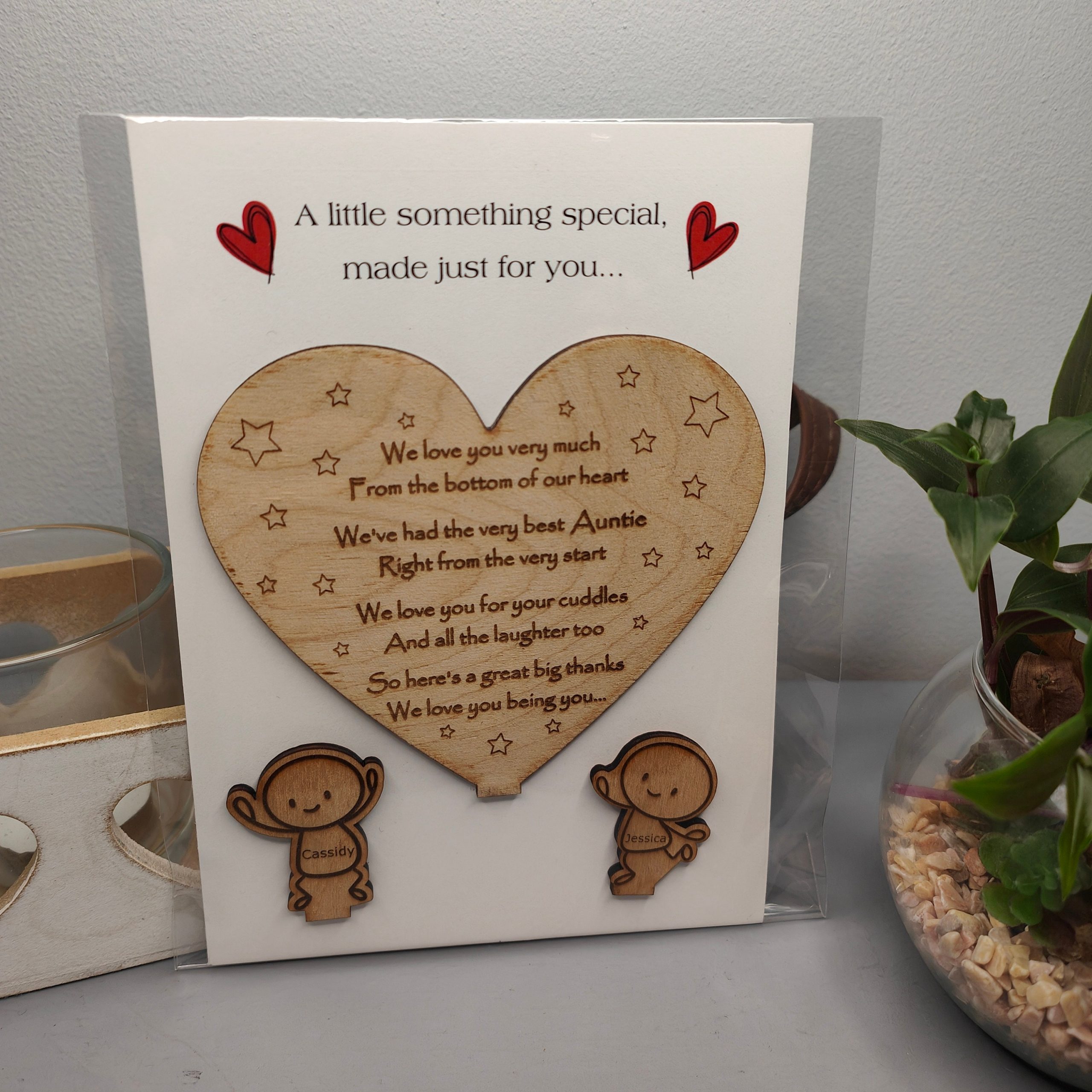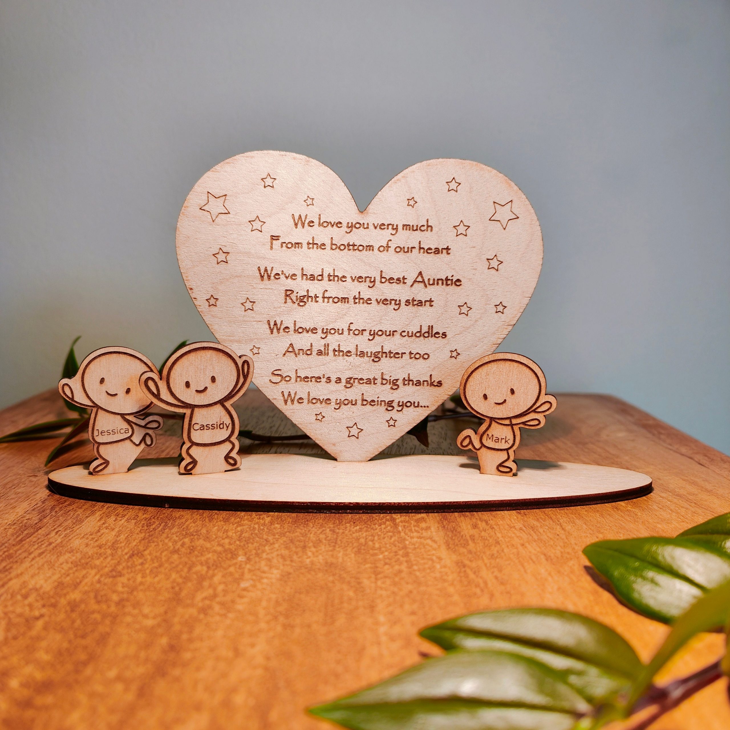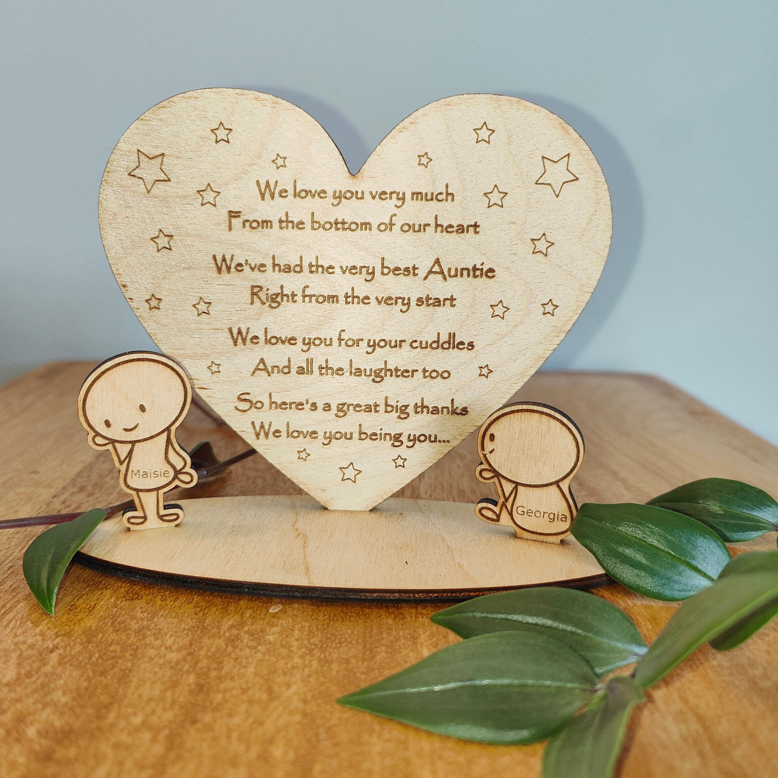 This adorable wooden heart ornament with Sentimental poem makes a fantastic personalised gift for Aunty or Uncle from their Niece or Nehew for a Birthday, Christmas, Mothers Day, Fathers Day or just to show you care. We have designed this for Auntie or Uncle, but you could have Aunt, Aunty or whatever you would like. Just let us know im the personalisation section or drop us a message. Choose from 8 poses that best reflect the character of the kids. For that extra special touch customise with the childrens names.