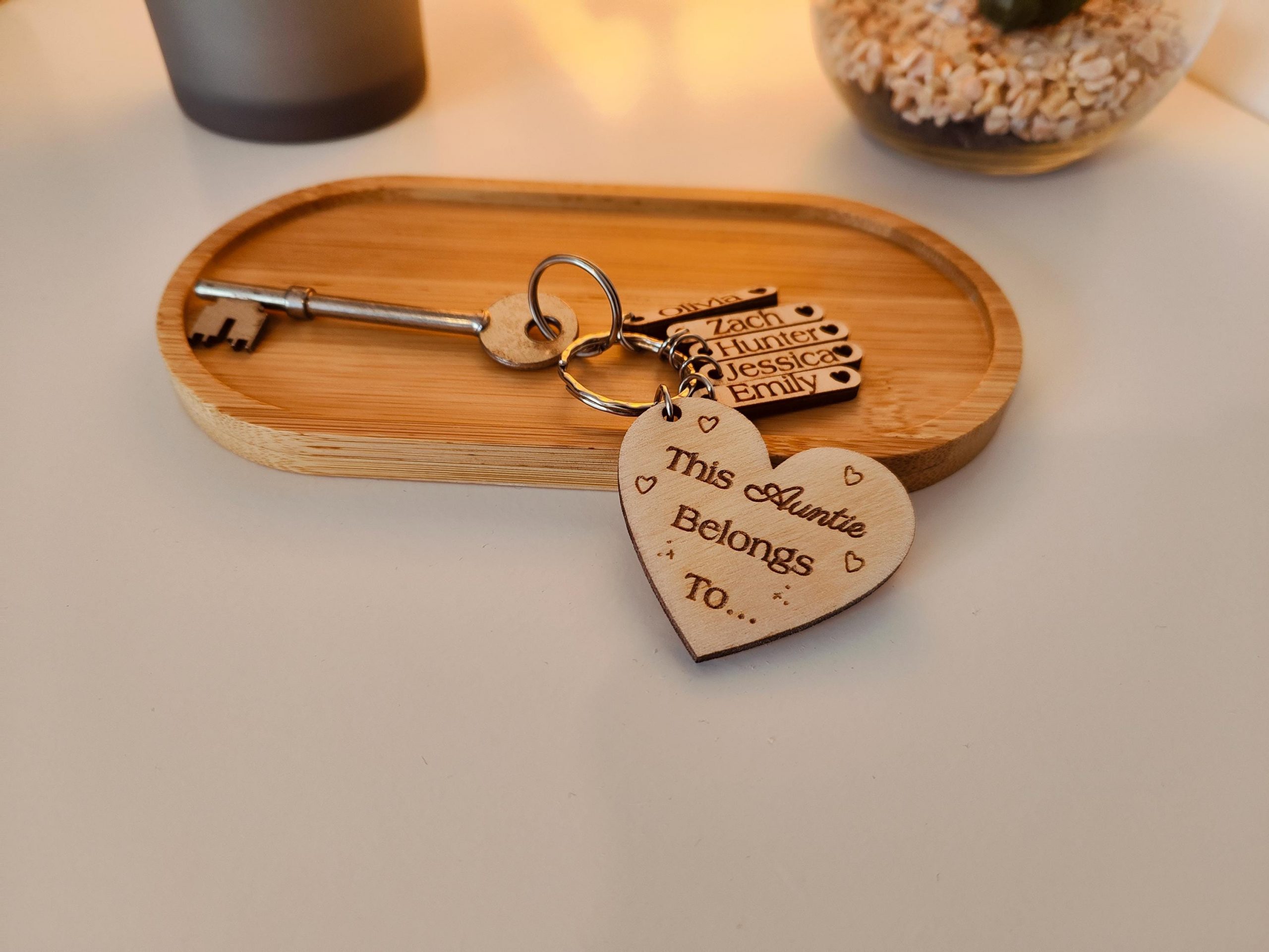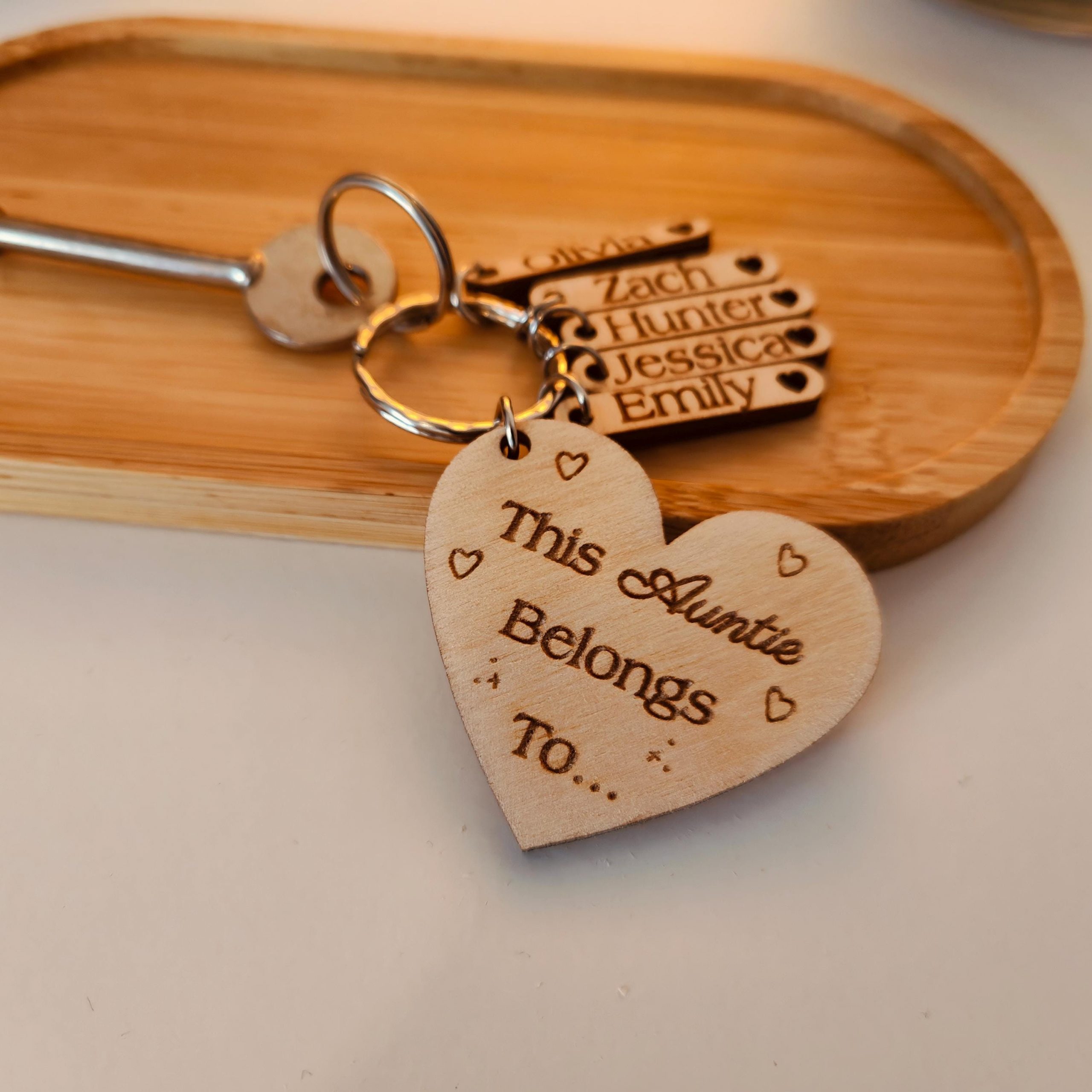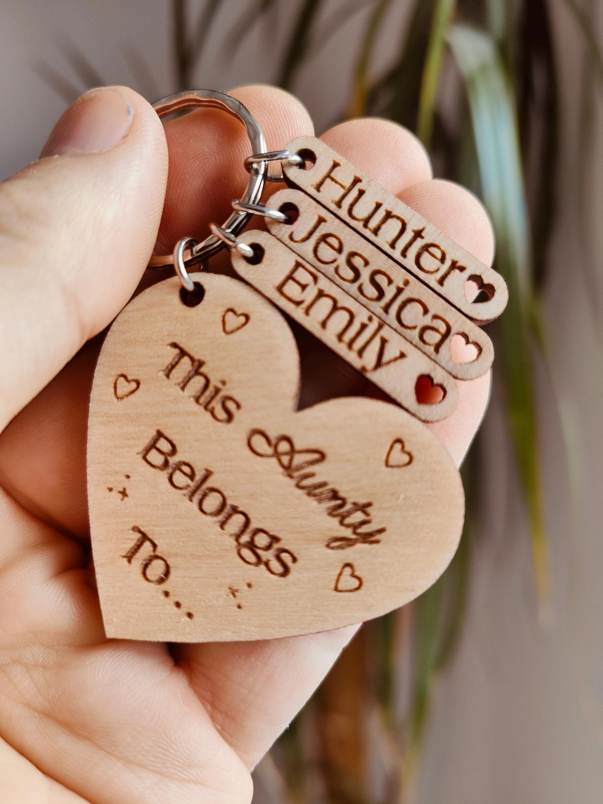 This adorable heart shaped wooden keyring with the phrase ‘This Auntie belongs to…’ is the perfect gift for any occasion, whether it’s for a birthday, Christmas, Mothers Day or just to show them you care, this would make the ideal present. We have designed this with ‘Auntie’ on it but this can easily be customised to be Aunty, Aunt or whatever you would like. Make this extra special by adding the Niece or nephew childrens names on their own tag with cut out heart. We don’t charge extra for each tag, so ideal whether you are a small or large family.