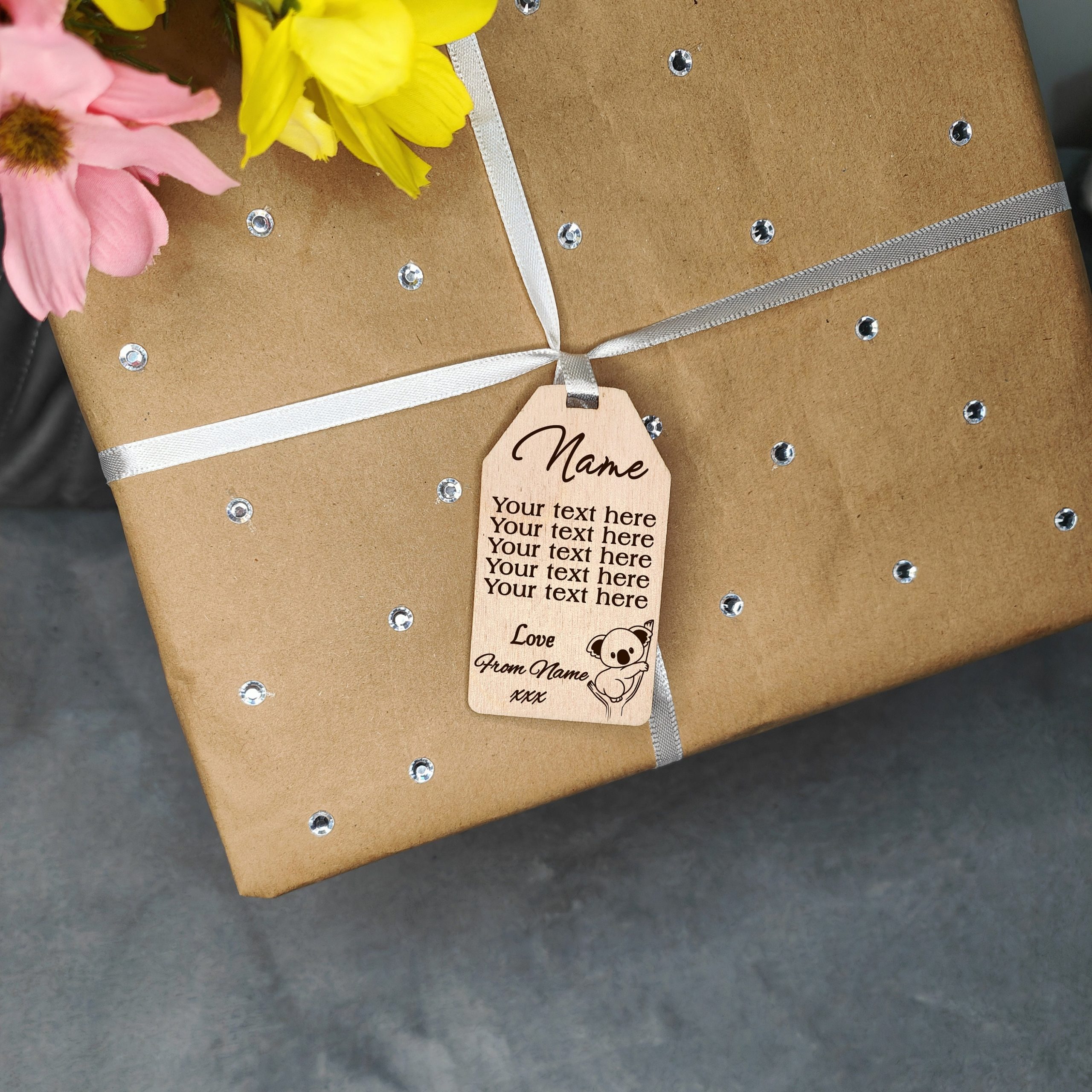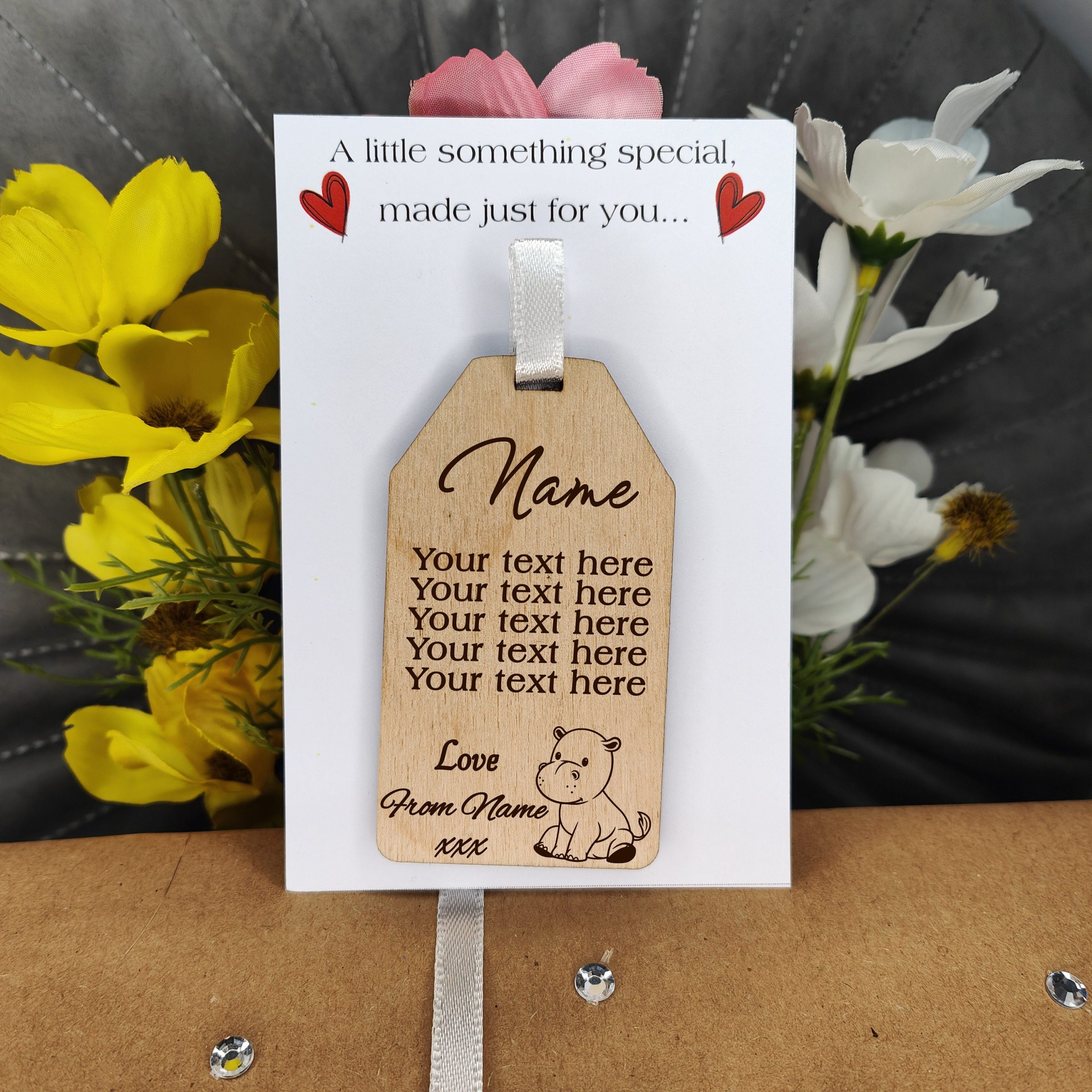 This is an adorable wooden label or gift tag with your choice of animal design, choose from an elehant, hippo, giraffe, lion and Koala, this is the perfect finishing touch whether you’re giving a present, or a gift bag. We have left this one blank for you to choose your own text and then personalise with the recipients name and the senders name for those extra special touches. Comes with a satin white ribbon for easy attaching and is delivered on mounting card in cellophane for protection.