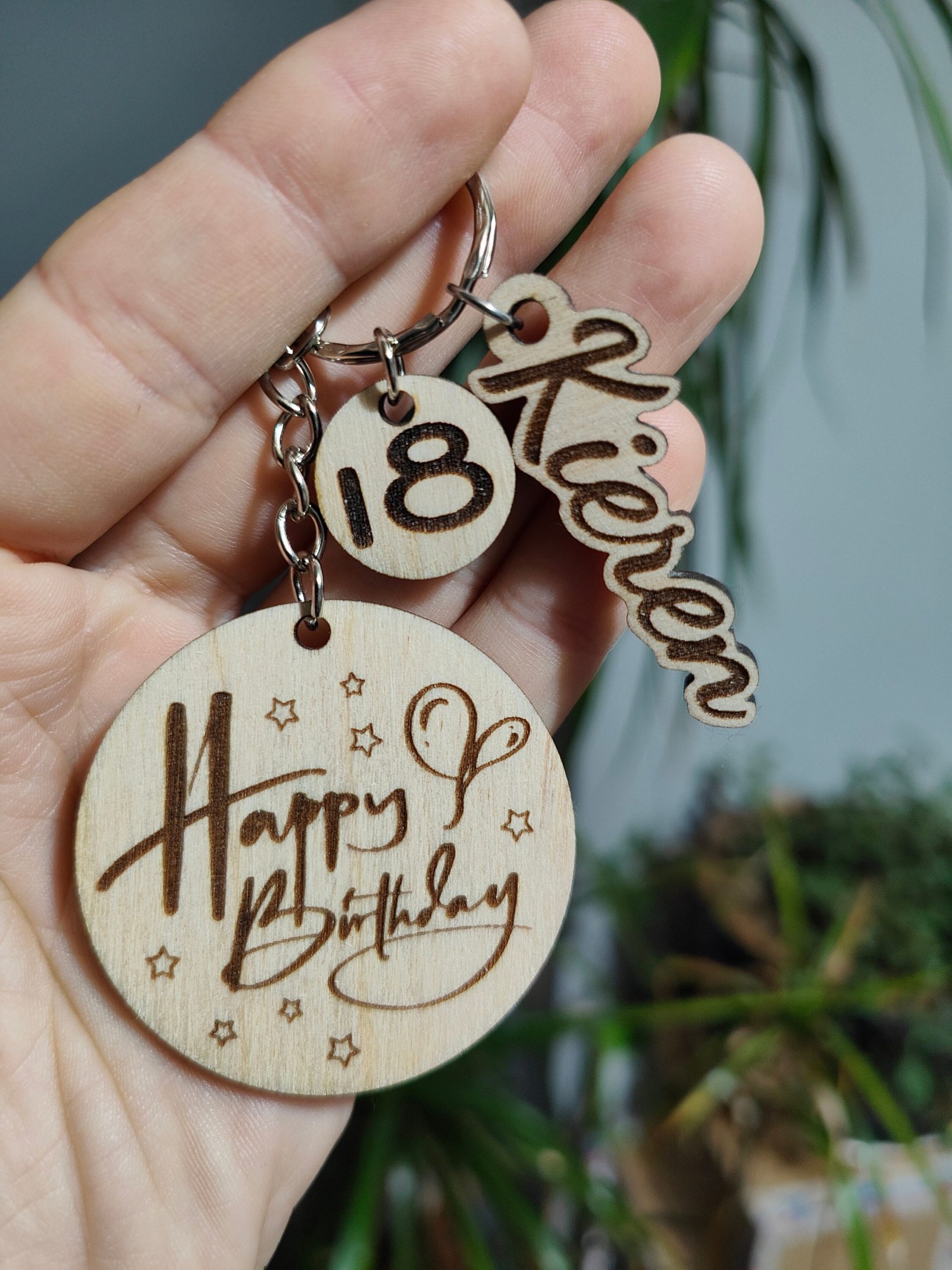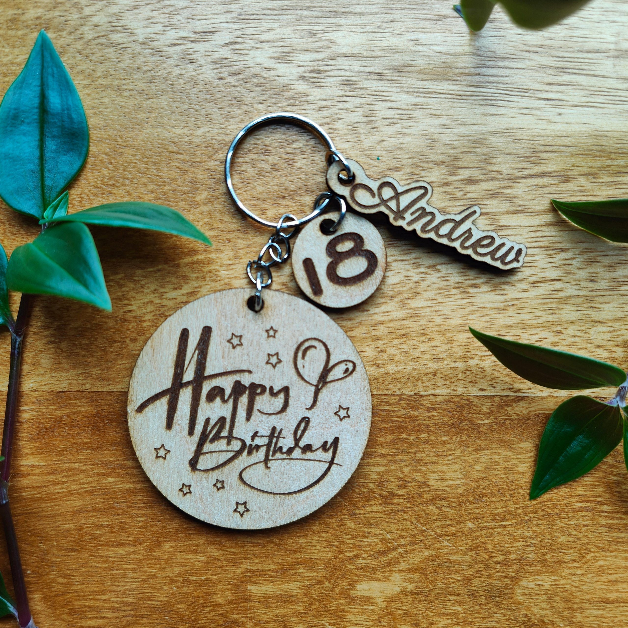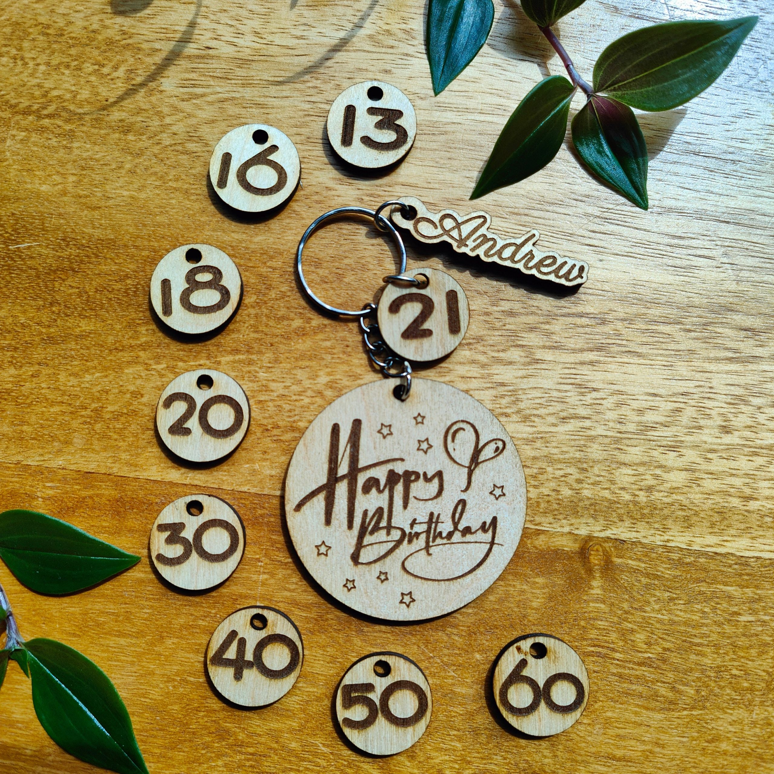 Personalised Birthday Keyring: Laser Engraved Wooden Name & Age Gift