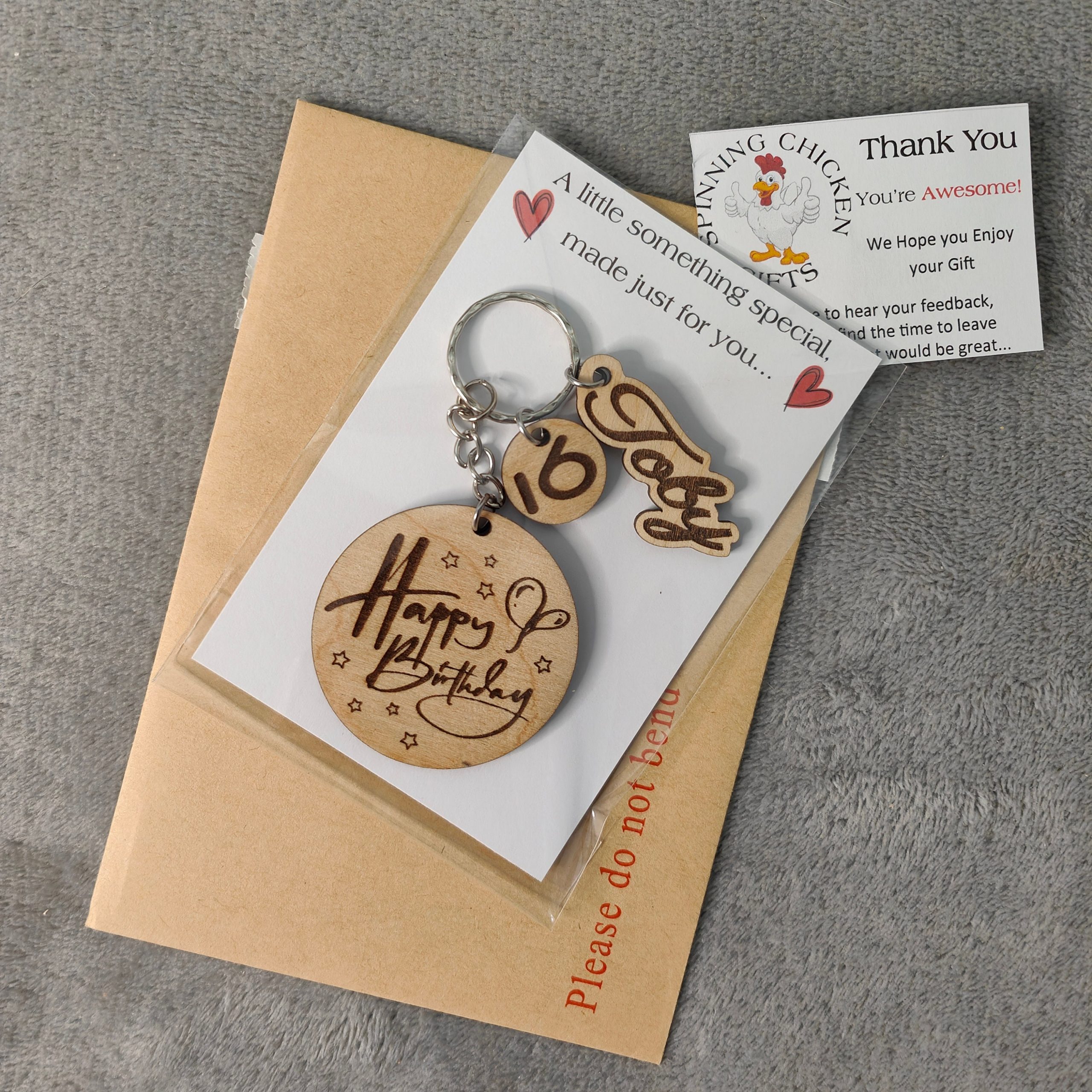 This cute wooden happy birthday keyring makes a fantastic gift for a special Birthday. This keychain can be personalised with any name and age to make an extra special gift for your loved one. Would be suitable for boys, girls, ladies or men, him or her. It’s Ideal for all age Birthdays including they key ones: 13th, 16th, 18th, 20th, 21st, 25th, 30th, 40th, 50th, 60th or any other milestone birthdays. Presented on White backed card in a clear protective pocket to make the perfect gift. If you want anything other than a name or age, just let us know in the perosnalisation section or drop us a message, we would be more than happy to help.
