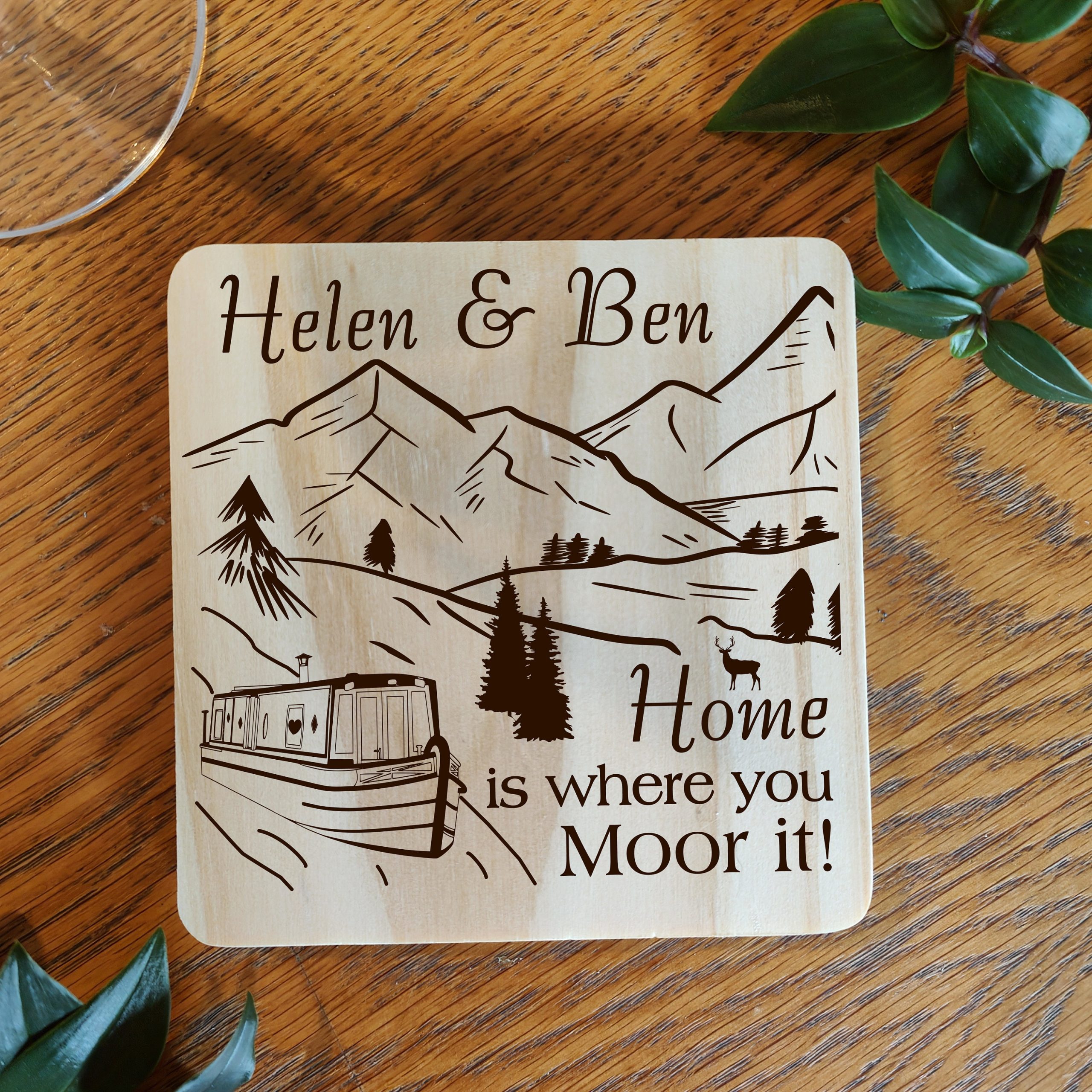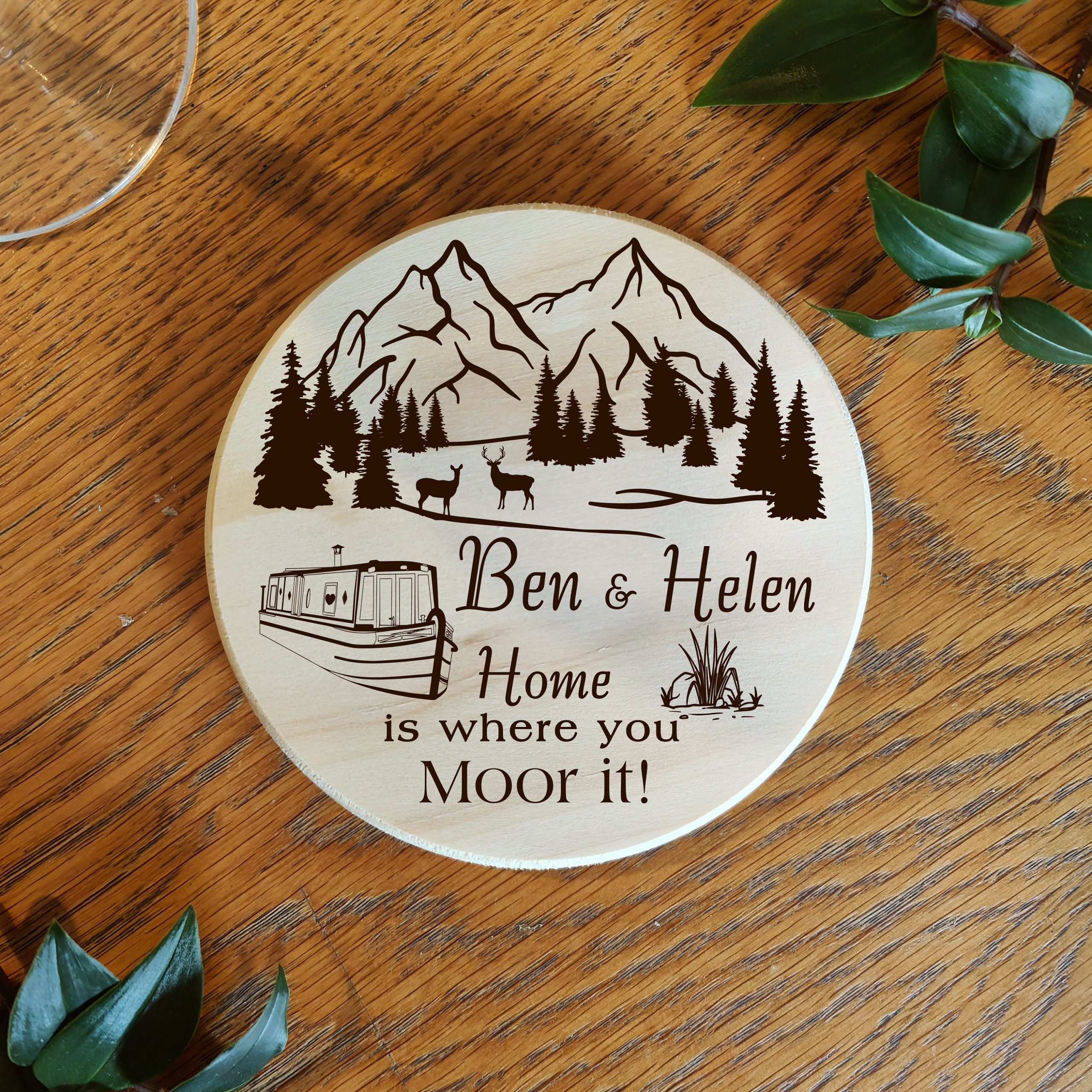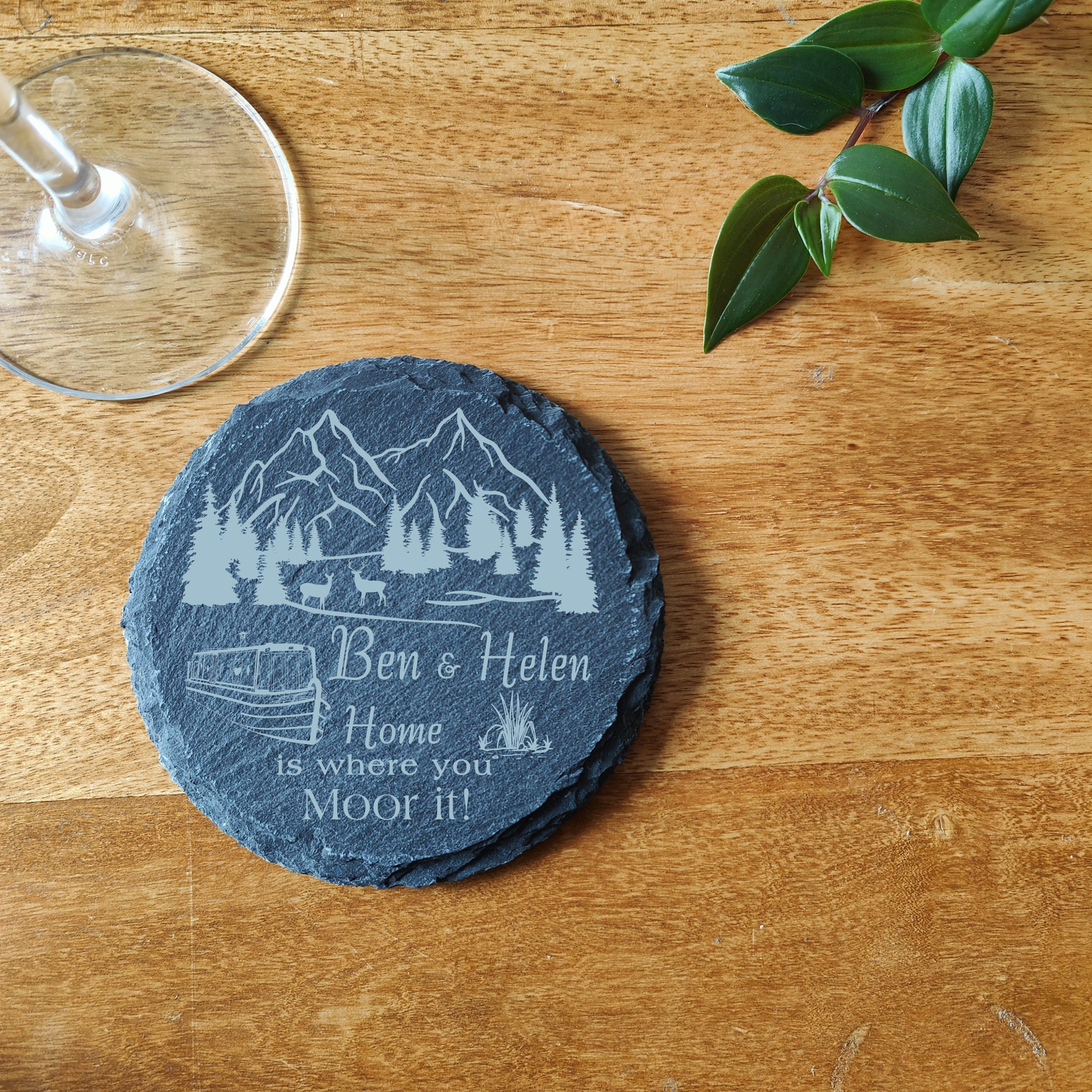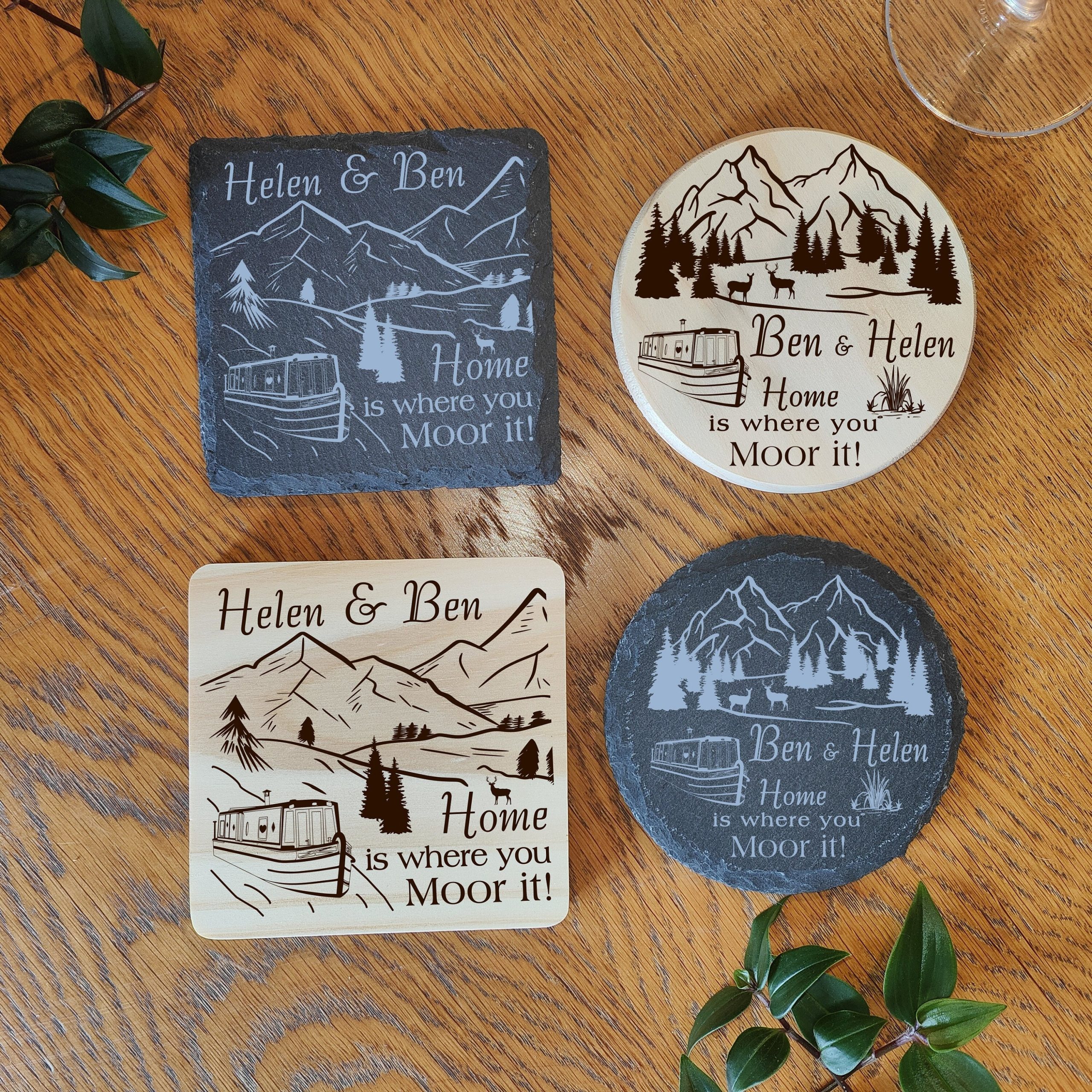 These Coasters makes a nice addition to any Coffee table in Your Home From Home. Perfect gift for Owners of Narrow Boats Barges or Canal Boats, Any name or Text can be added. High quality Natural Slate or Pine Wood