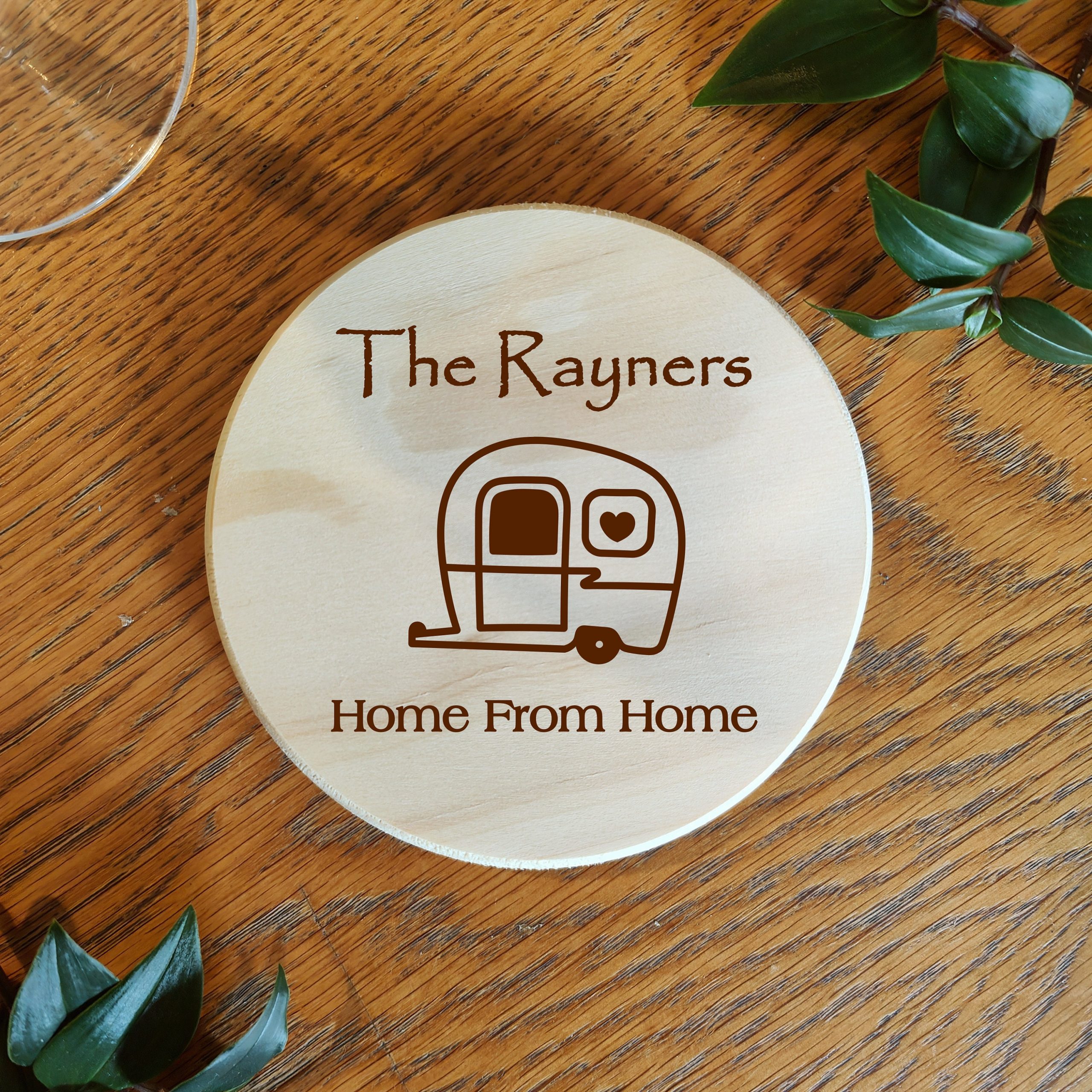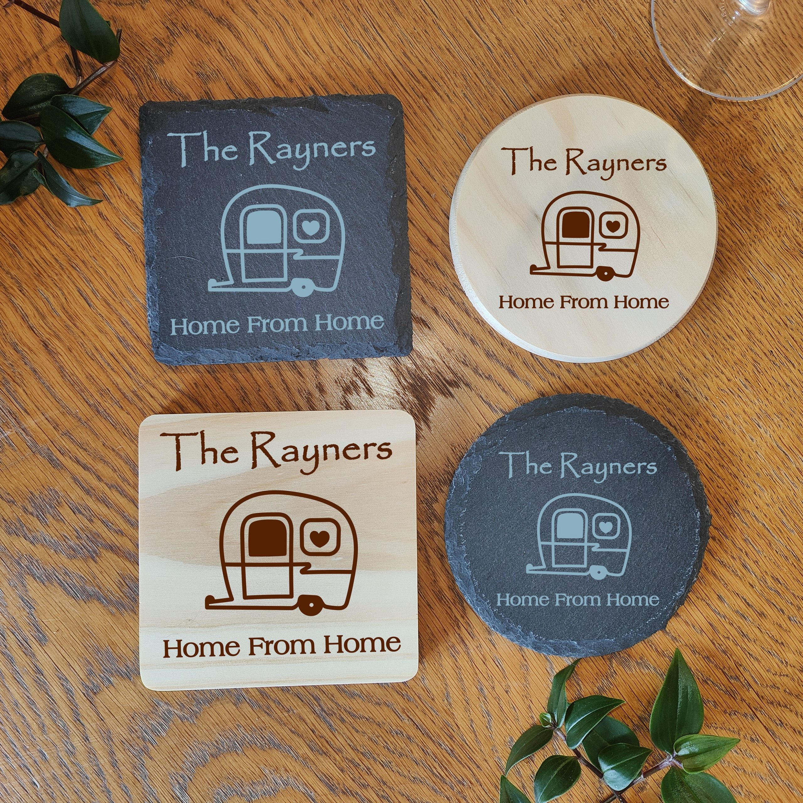 Personalised Caravan Gift Drink Coaster Laser Engraved Wood or Slate ideal gift for Birthday Christmas occasions for Him Her