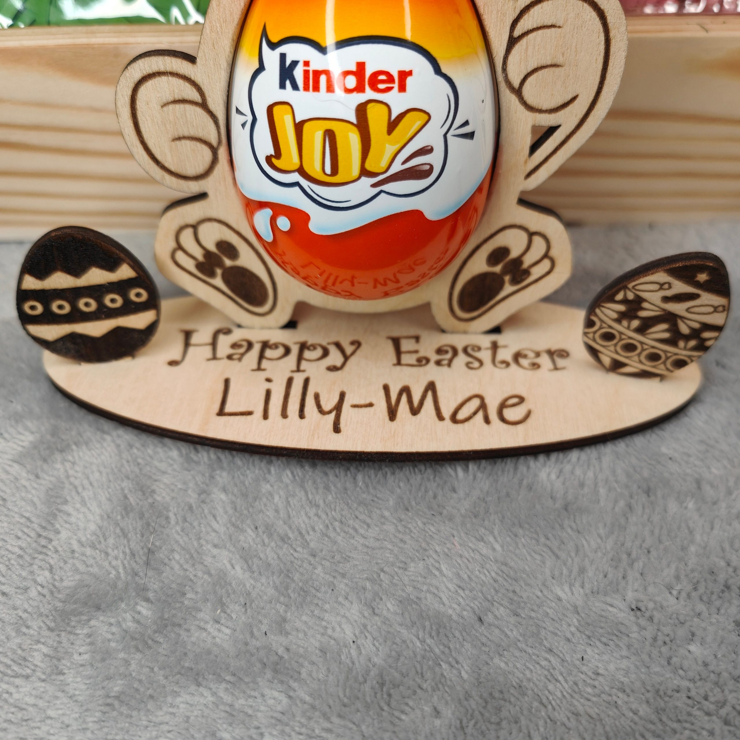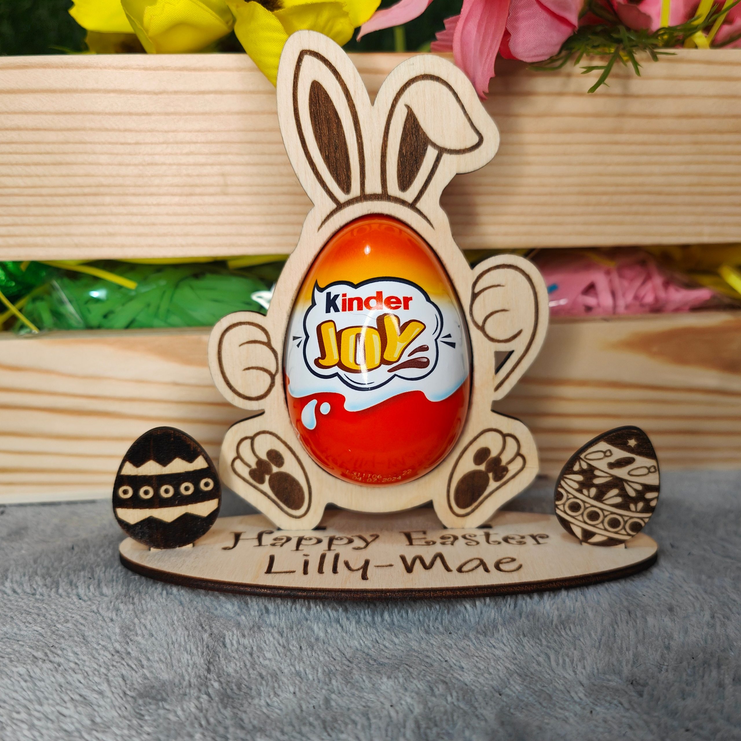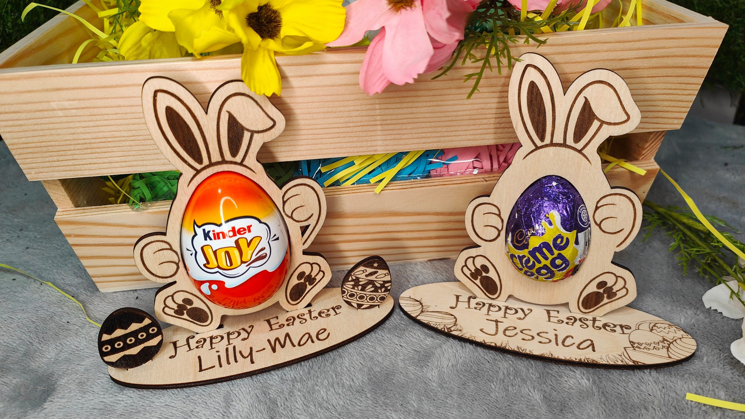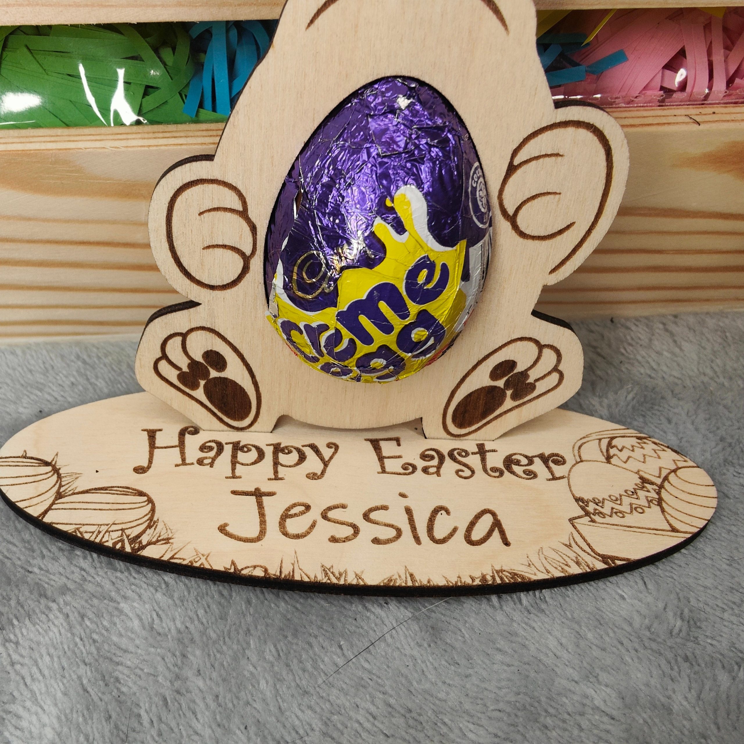 This absolutely adorbale Easter egg holder will make the perfect gift for the children this Easter and can be re-used year after year. Treat the Grandchildren, Niece, Nephew, Cousin or anyone else to this cute Easter Present. We have designed this to say Happy Easter, but if you would like a different phrase, Happy 1st Easter, Enjoy your Chocolate or whatever you fancy, then let us know in the personalisation section or drop us a message. This Easter Ornament is available in two sizes to fit either a Creme Egg or a Kinder Joy. The bunny stands up on its own base and you have two styles to choose from, one base has a Easter egg theme, where you can personalise the Childs Name, the other can also be personalised with the childs name but it has an additional two mini easter eggs for that extra 3D effect. They are delivered mounted on White card and cellophane wrapped for protection. EASTER EGG NOT INLCUDED