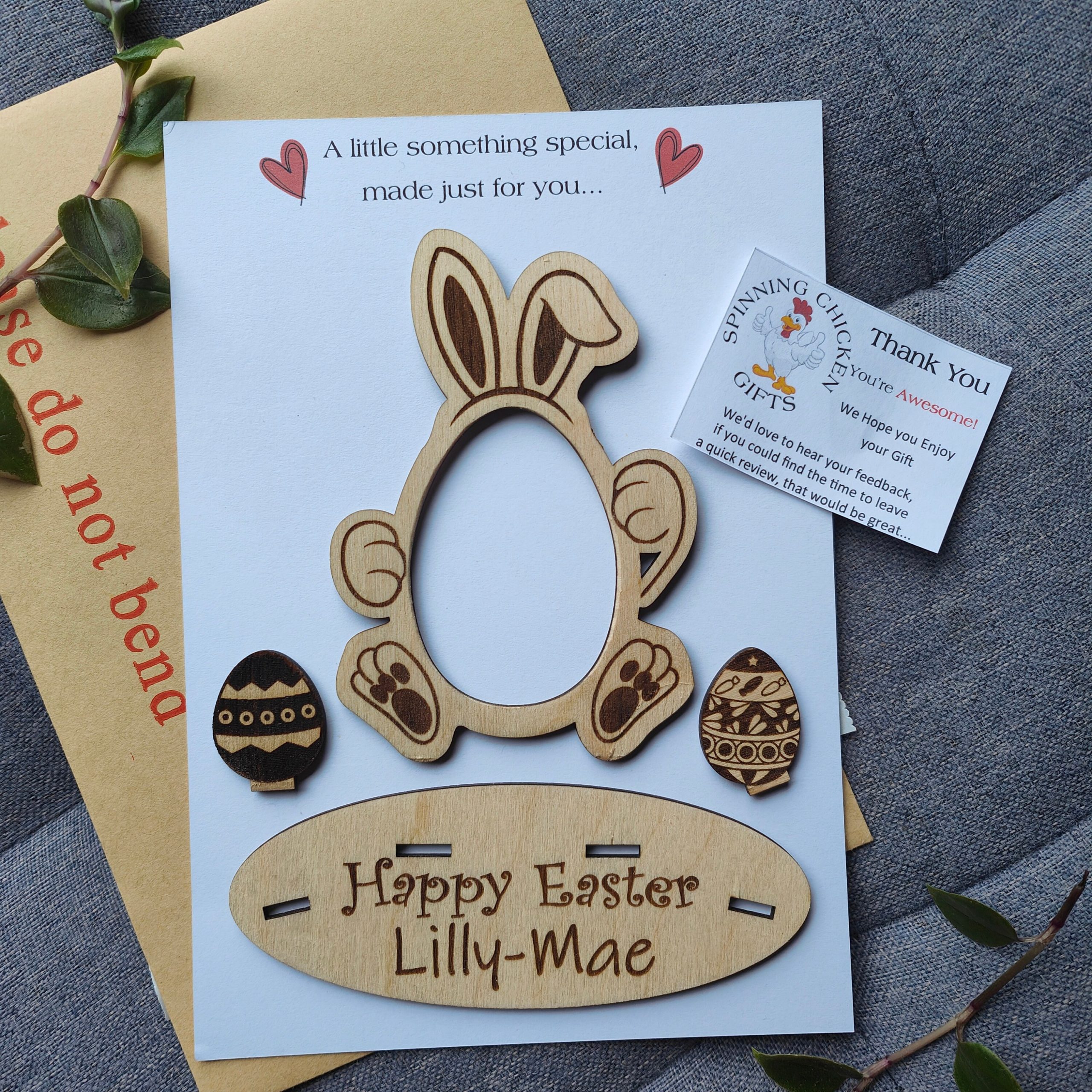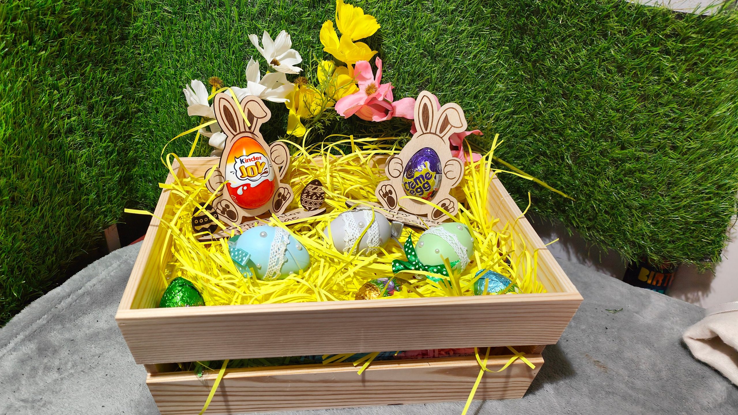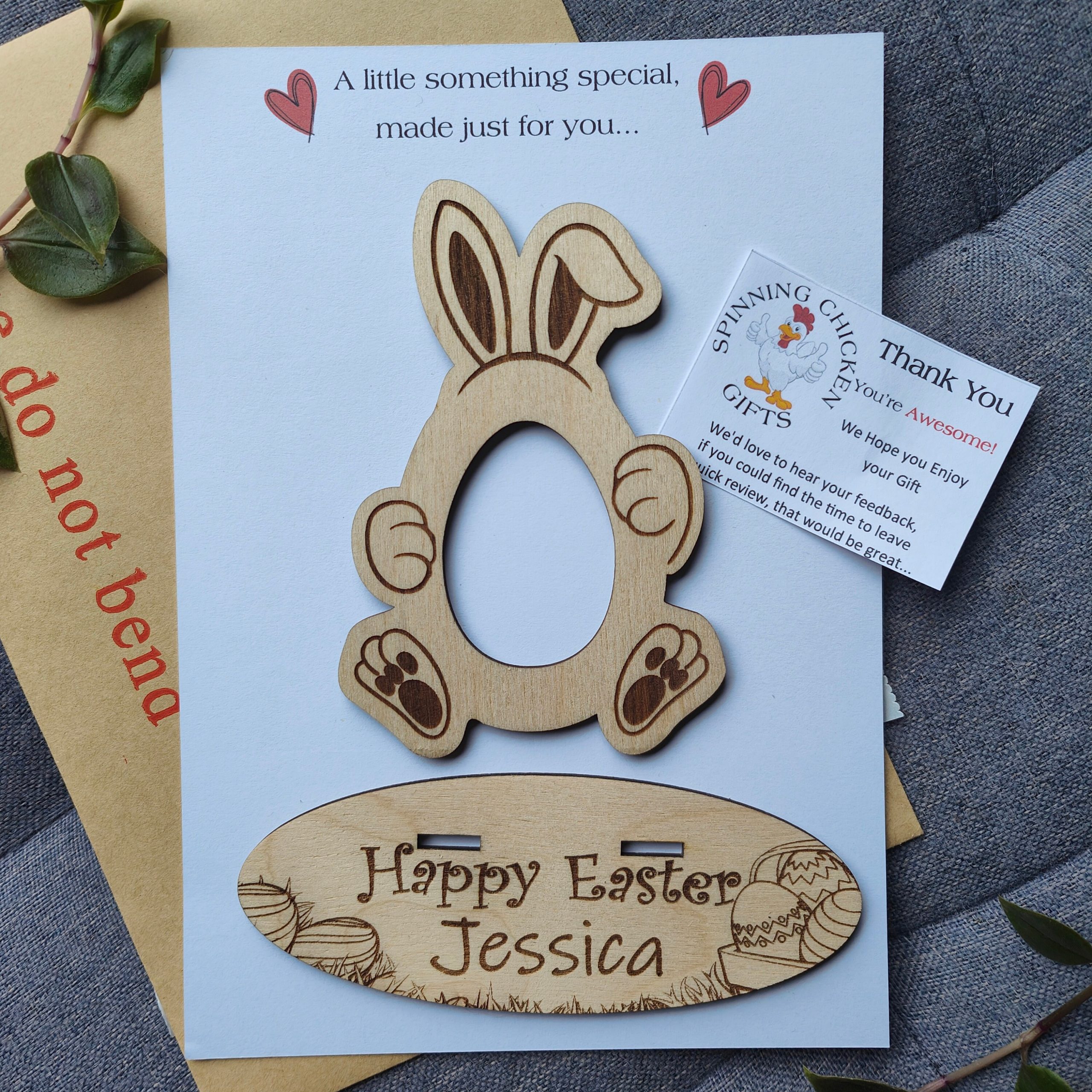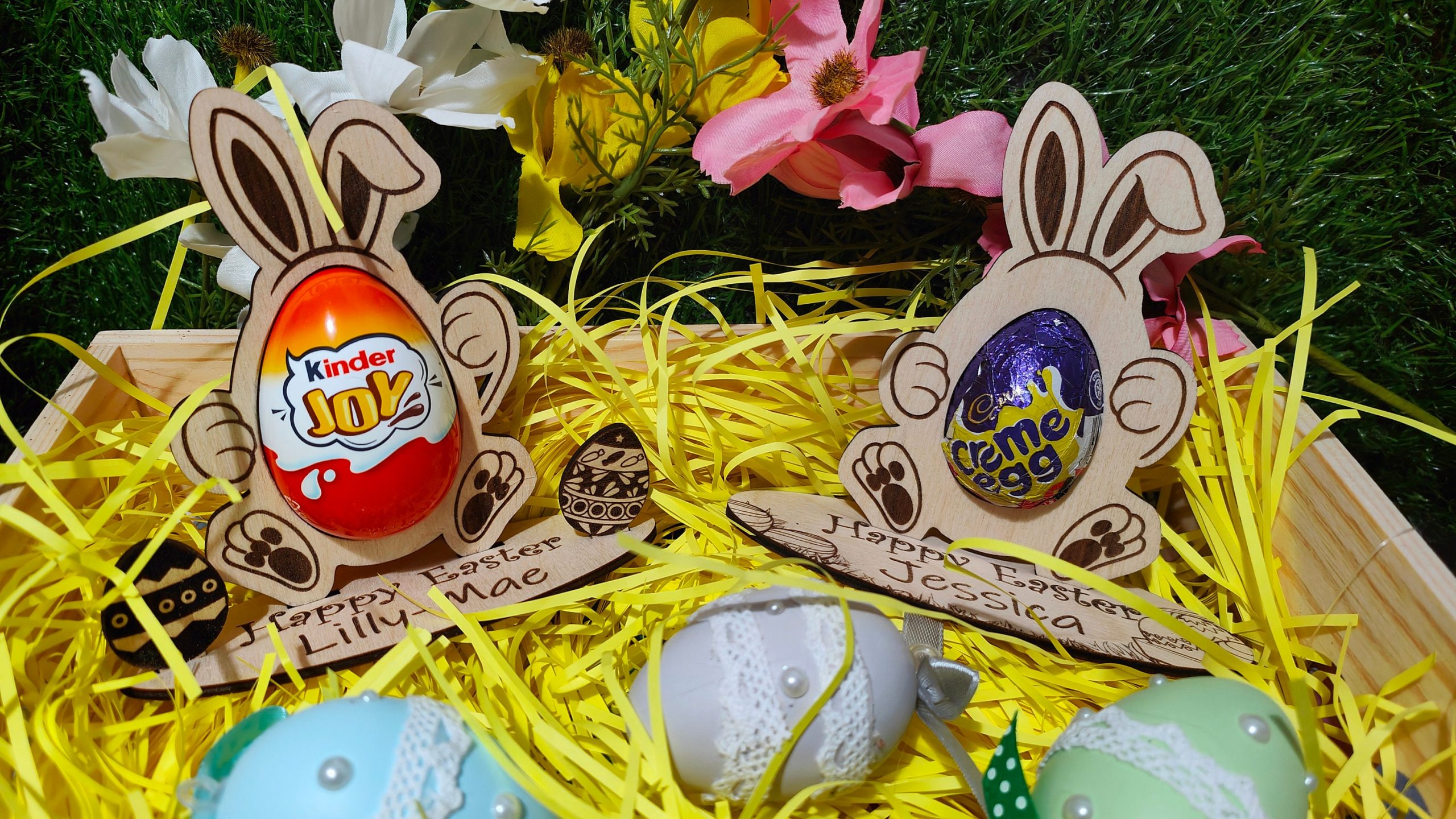 This absolutely adorbale Easter egg holder will make the perfect gift for the children this Easter and can be re-used year after year. Treat the Grandchildren, Niece, Nephew, Cousin or anyone else to this cute Easter Present. We have designed this to say Happy Easter, but if you would like a different phrase, Happy 1st Easter, Enjoy your Chocolate or whatever you fancy, then let us know in the personalisation section or drop us a message. This Easter Ornament is available in two sizes to fit either a Creme Egg or a Kinder Joy. The bunny stands up on its own base and you have two styles to choose from, one base has a Easter egg theme, where you can personalise the Childs Name, the other can also be personalised with the childs name but it has an additional two mini easter eggs for that extra 3D effect. They are delivered mounted on White card and cellophane wrapped for protection. EASTER EGG NOT INLCUDED
