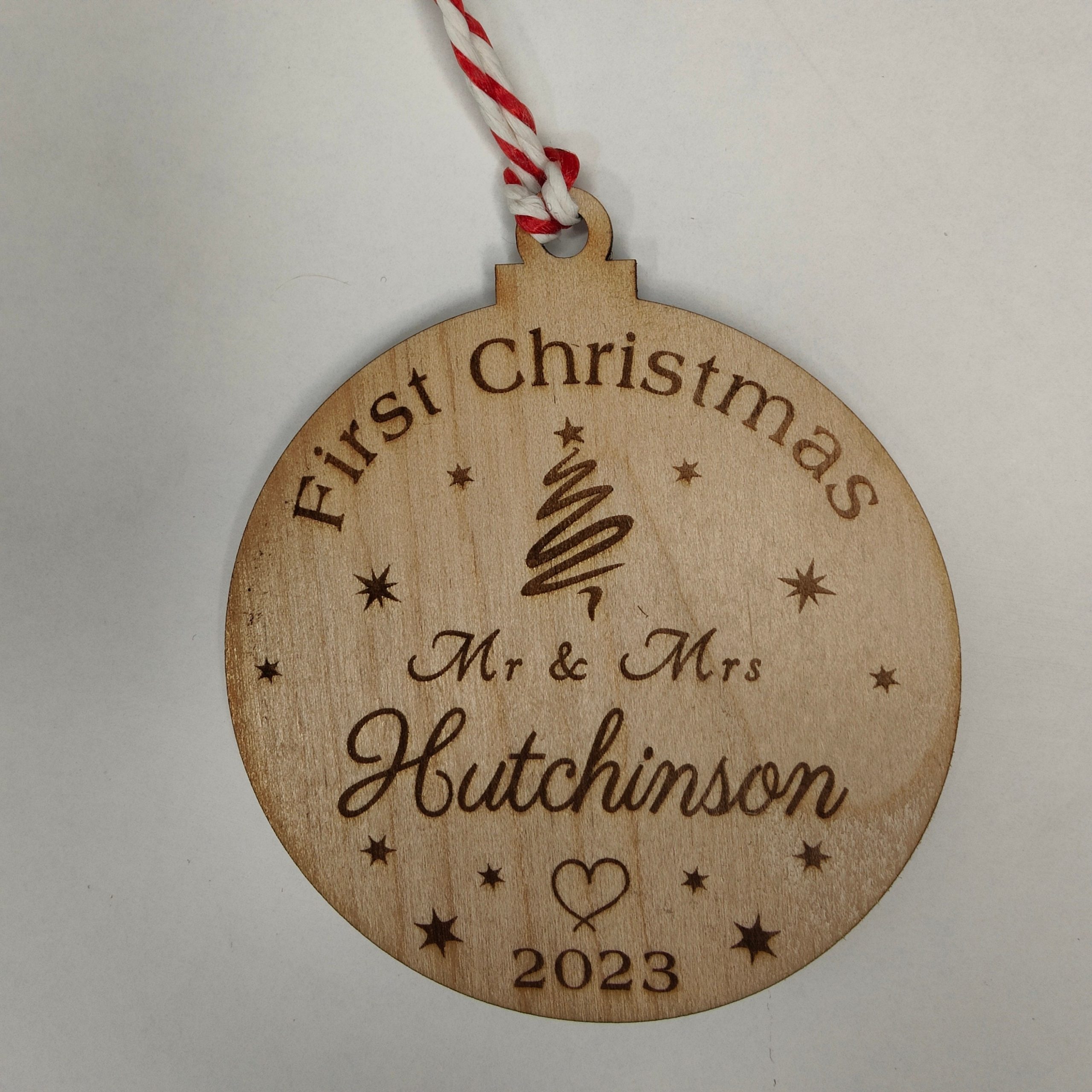 This Tree ornament makes a fantastic addition to any Christmas trees to remember your first Christmas as a couple. Can also include alternate couple genders such as Mr & Mr, Mrs & Mrs or be used as an Xmas wall Ornament. High quality wooden Xmas tree decoration personalised with any name or alternative, The perfect for any size Christmas tree.