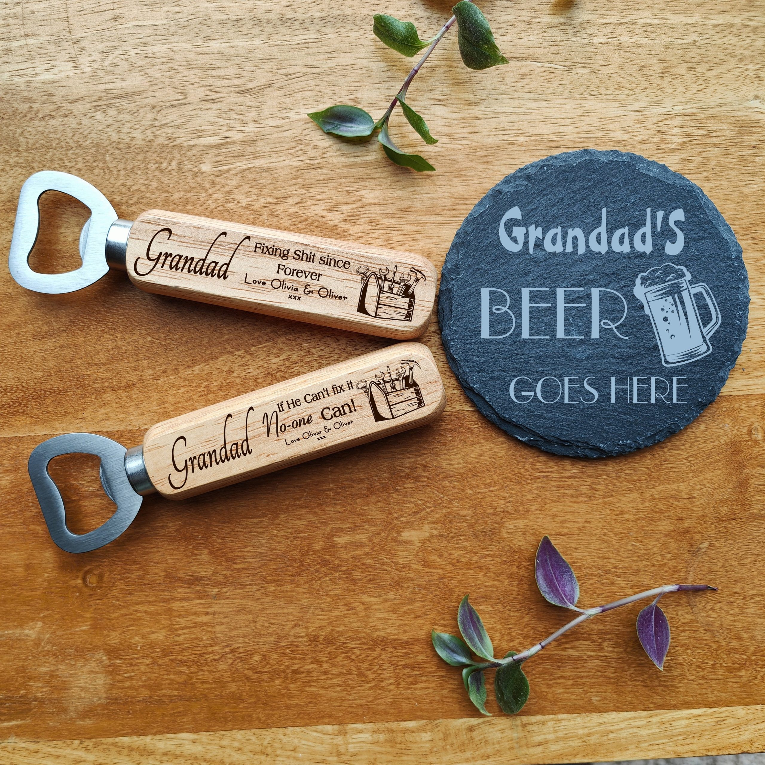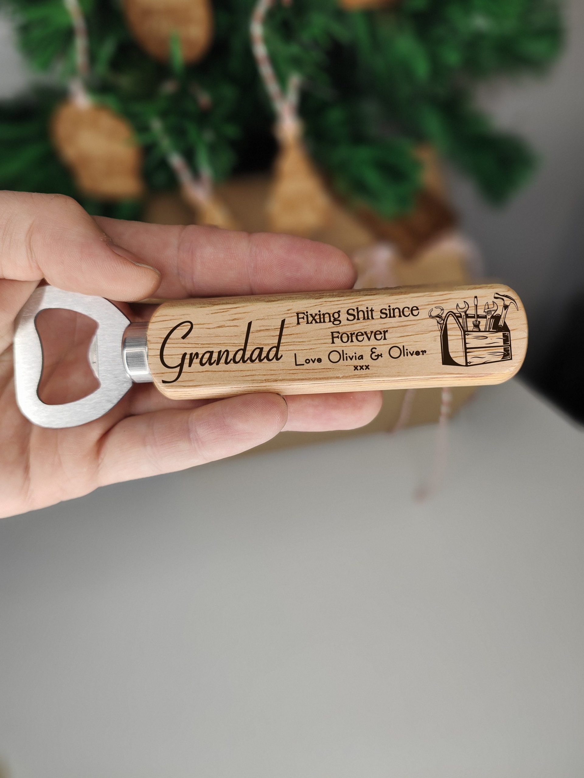 This lovely wooden bottle opener makes an ideal gift for those clever people who van fix everything! We’ve used Grandad but it works for Grandma too if she’s handy with a hammer! Whether it’s Fathers day, Mothers day, birthdays or Christmas this quirky and somewhat cheeky little gift is perfect. It can be engraved with any recipient name and for that extra special touch, add the from name(s) just let us know in the personalisation section. You could even add a date if you prefer, so it would read fixing sh*t since 2007 etc.