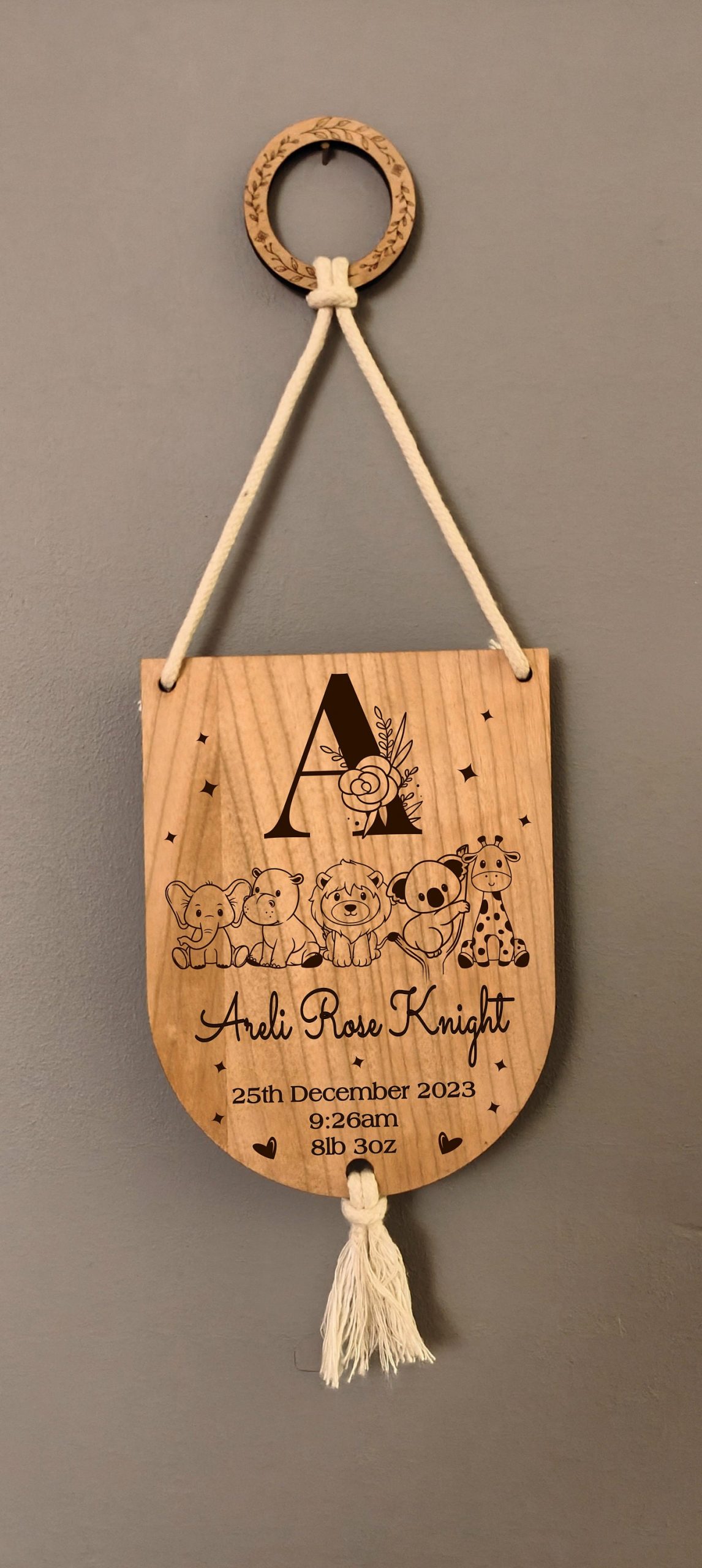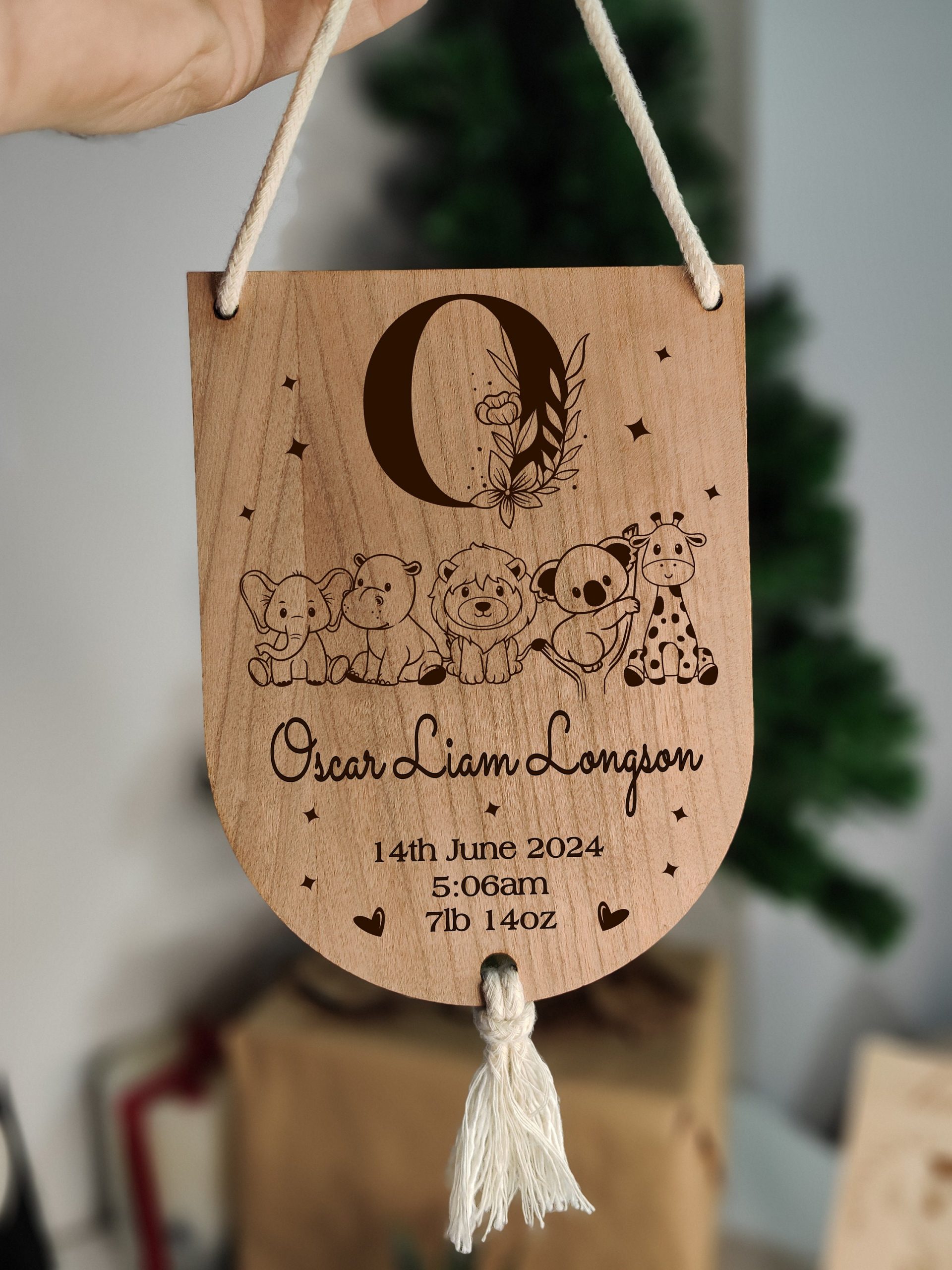 This adorable wooden wall art would make the perfect addition to any nursery or baby’s room. It’s jungle safari theme makes it ideal for both boys and girls, with its natural white cord and hoop detailing. So whatever nursery decor or theme you choose, this is sure to fit in perfectly. If you’re looking for a new baby arrival gift or a christening gift this would be perfect. Personalise it with name, date, time and weight.