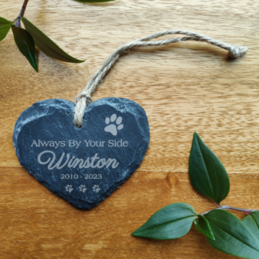 This Pet Memorial Heart makes a fitting tribute to commemorate lost loved ones who have left paw prints on your heart. Ideal for a Dog, Cat, Horse or any pet, we remember those fur babies who no longer walk beside us but are forever in our hearts and never forgtten. Whether it’s a Birthday Christmas, Anniversary or any other special date these slate hanging hearts can be displayed at the graveside, memorial garden or as tribute in your home. This high quality Slate Hanging heart can be personalised with any name, date and memorial text, such as Gone but Not Forgotten, My Faithful Friend, Run Free Now, In Loving Memory, Fly High with the Angels or whever short text/phrase you would like. The design features one large paw print and three small paw prints Presented on White backed card in a clear protective pocket.