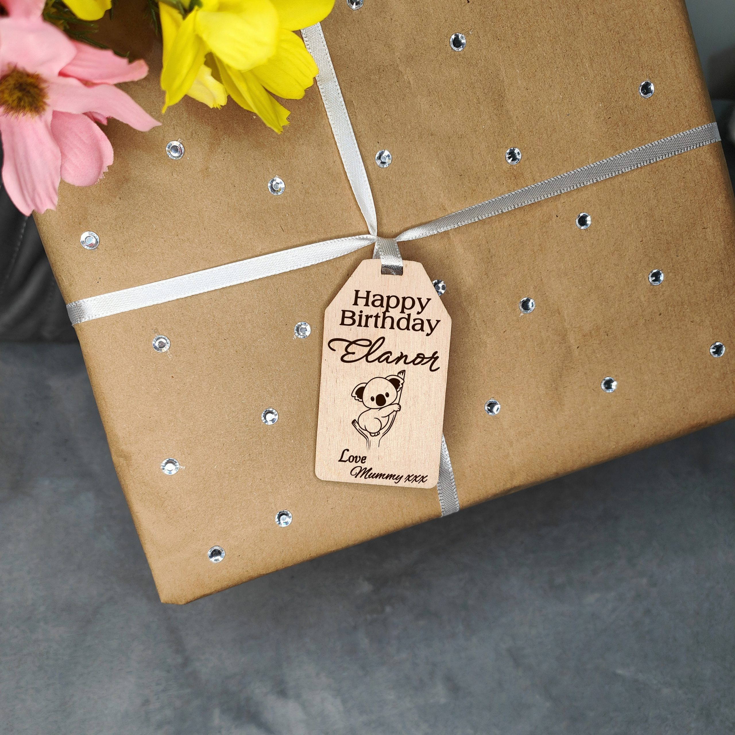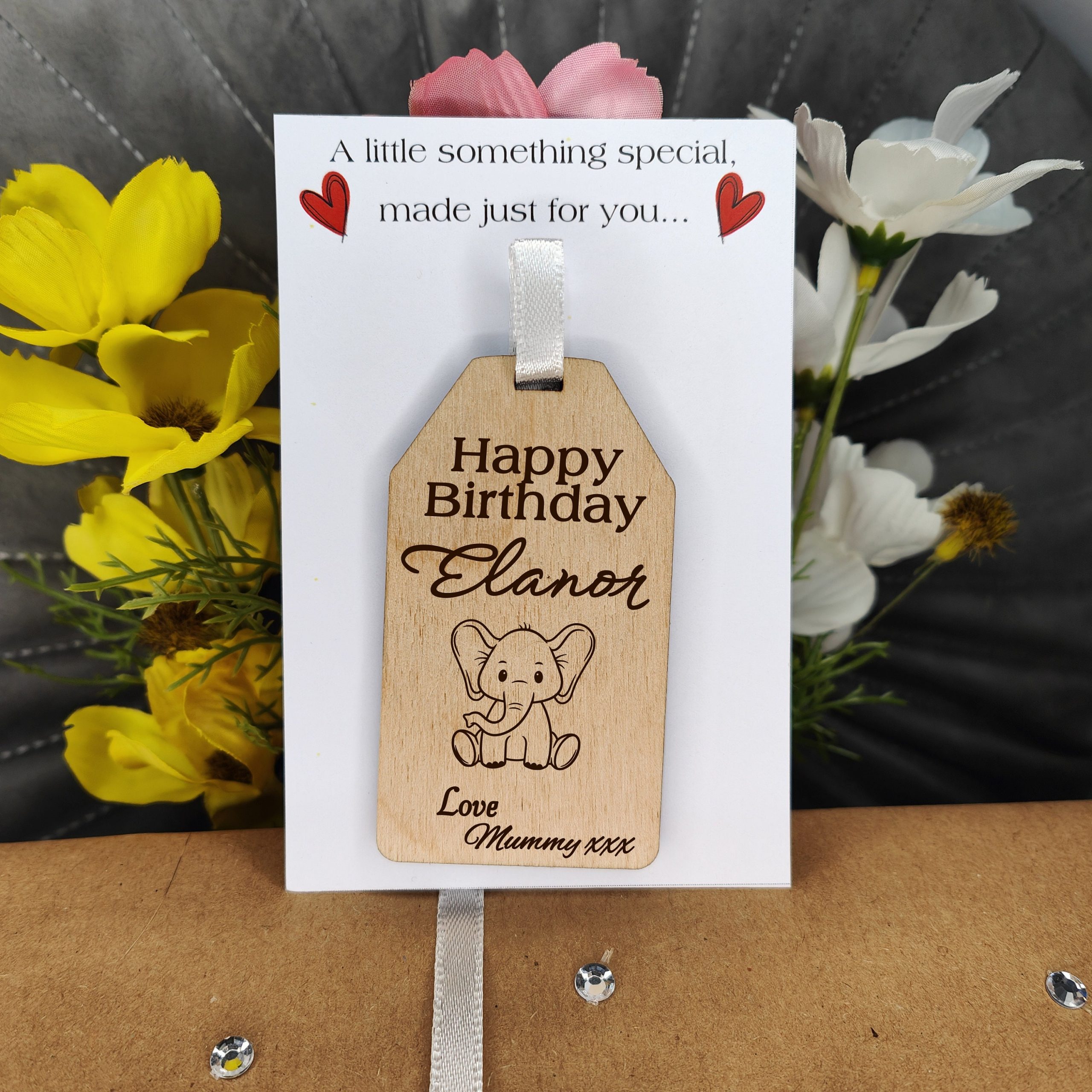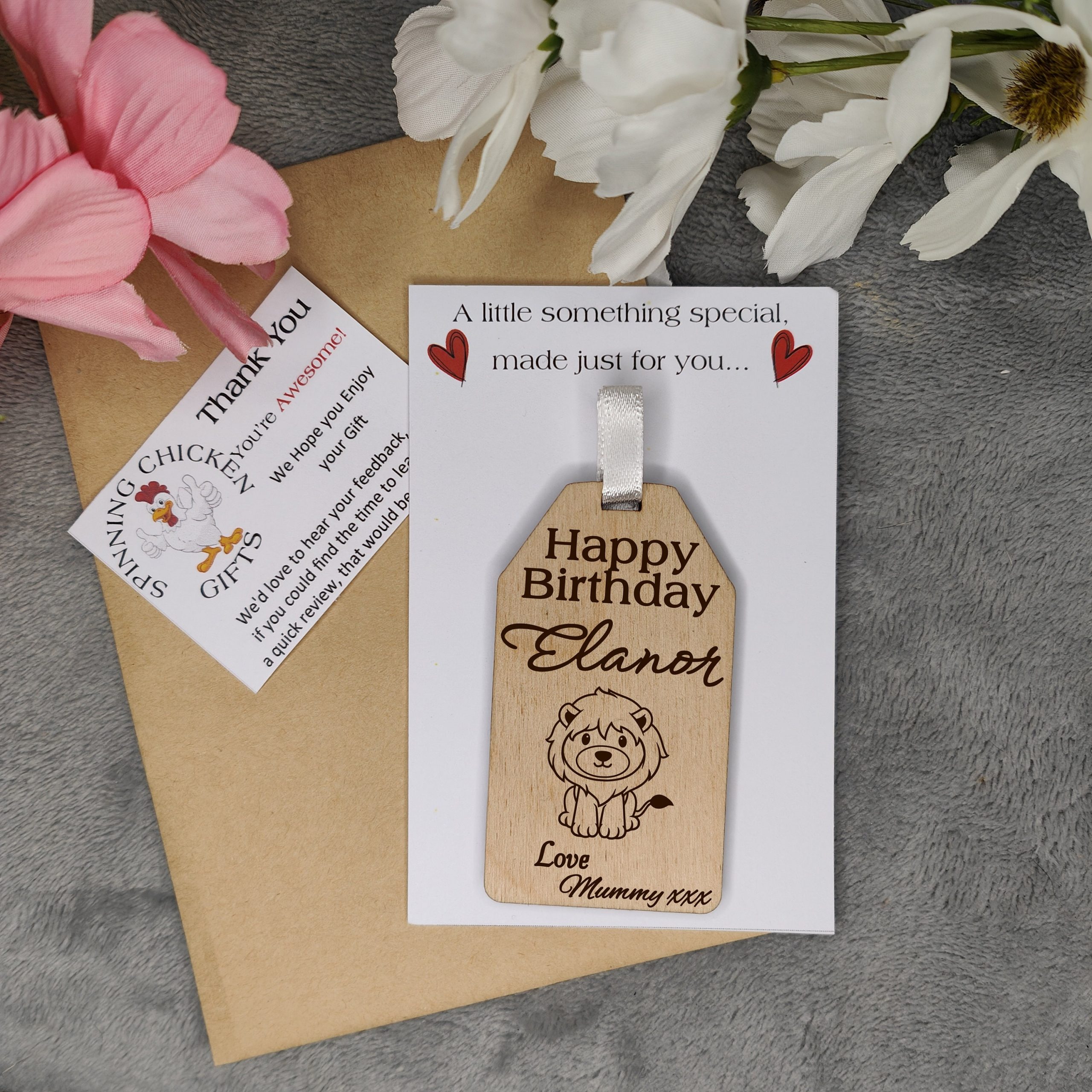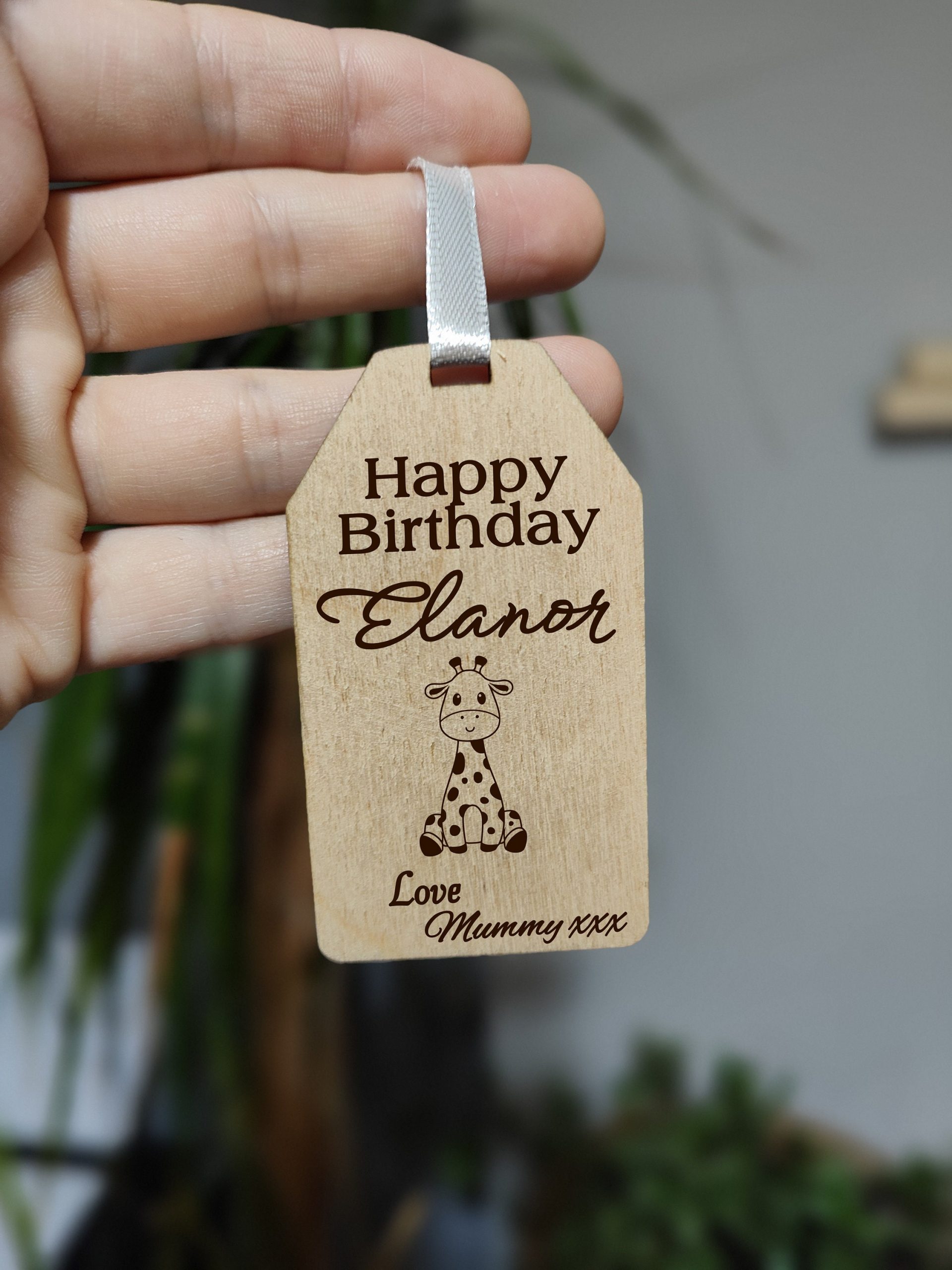 This is an adorable wooden label or gift tag with your choice of animal design, choose from an elehant, hippo, giraffe, lion and Koala, this is the perfect finishing touch whether you’re giving a present, or a gift bag. Personalise with the recipients name and the senders name for those extra special touches. Comes with a satin white ribbon for easy attaching and is delivered on mounting card in cellophane for protection.