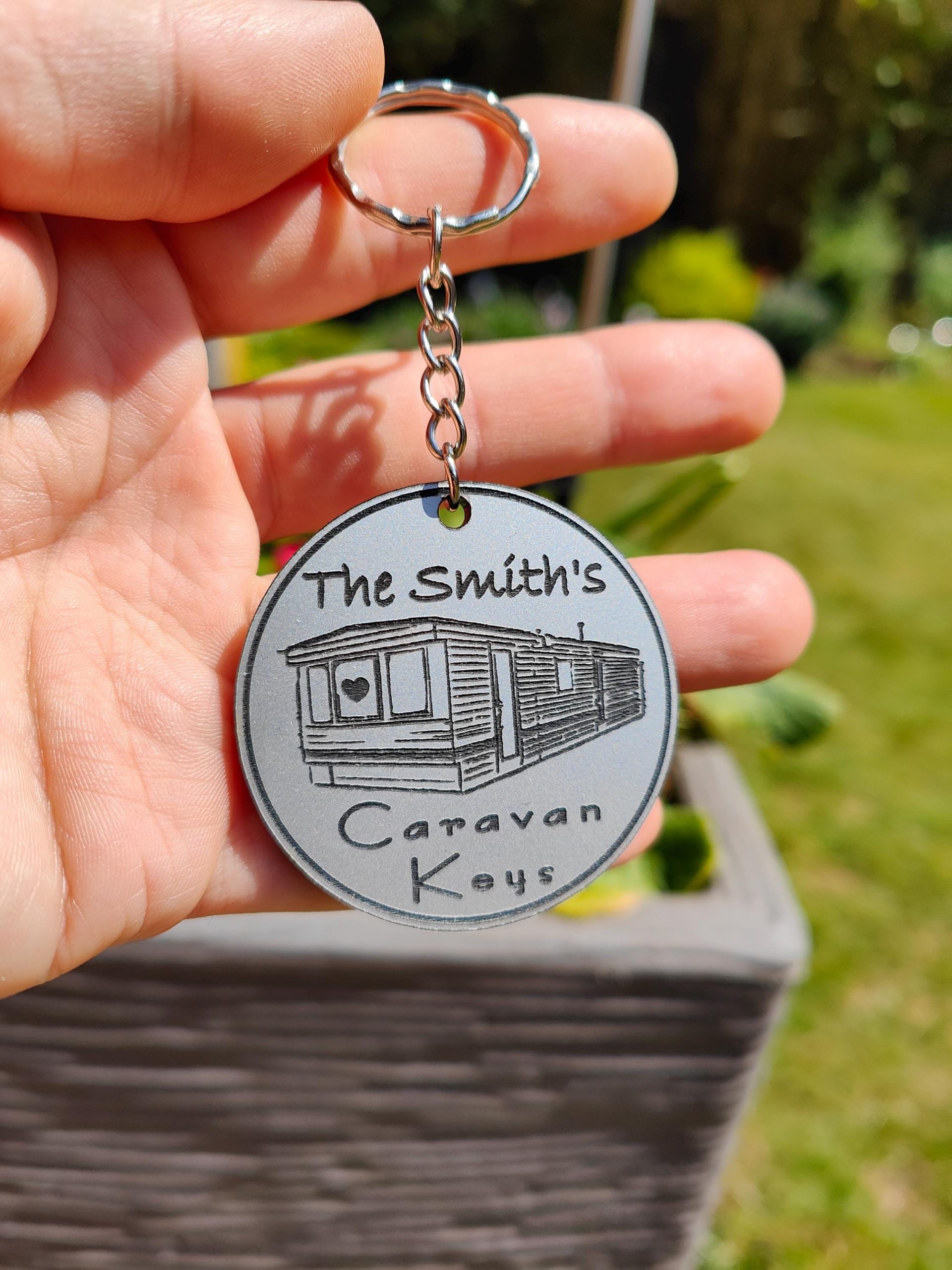 Personalised Static Caravan Keyring: Laser Engraved Acrylic Gift