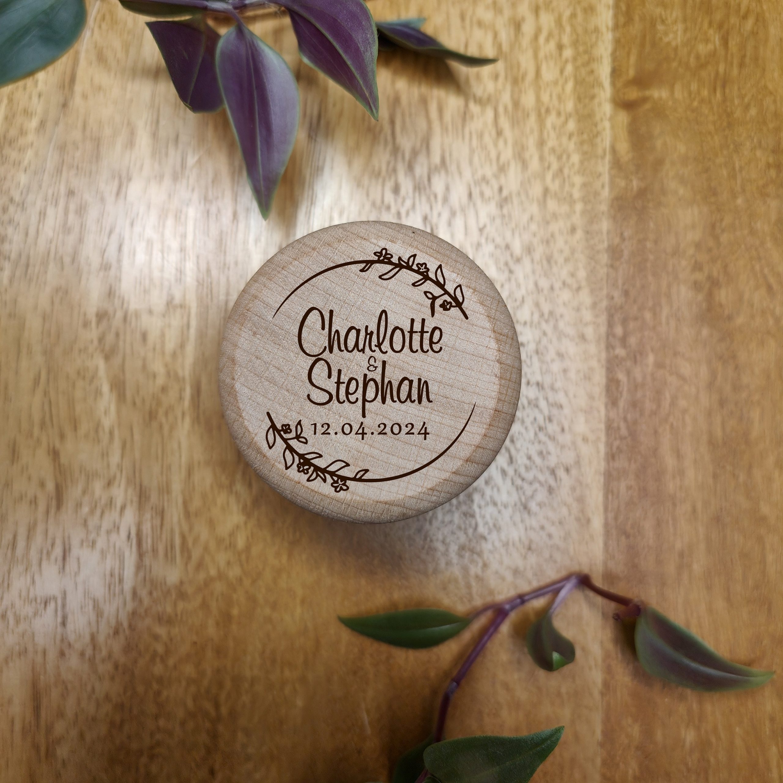 This cute little round wooden box makes a great way to store your wedding rings for your Special wedding day or Ceremony. Perfect for the ring bearer to keep your wedding rings safe, ready for that all important moment! An ideal keepsake for wedding, civil cermonies or proposals. Personalise it with names and a date to make it extra special. Three designs to choose from and large enough to hold all size rings.