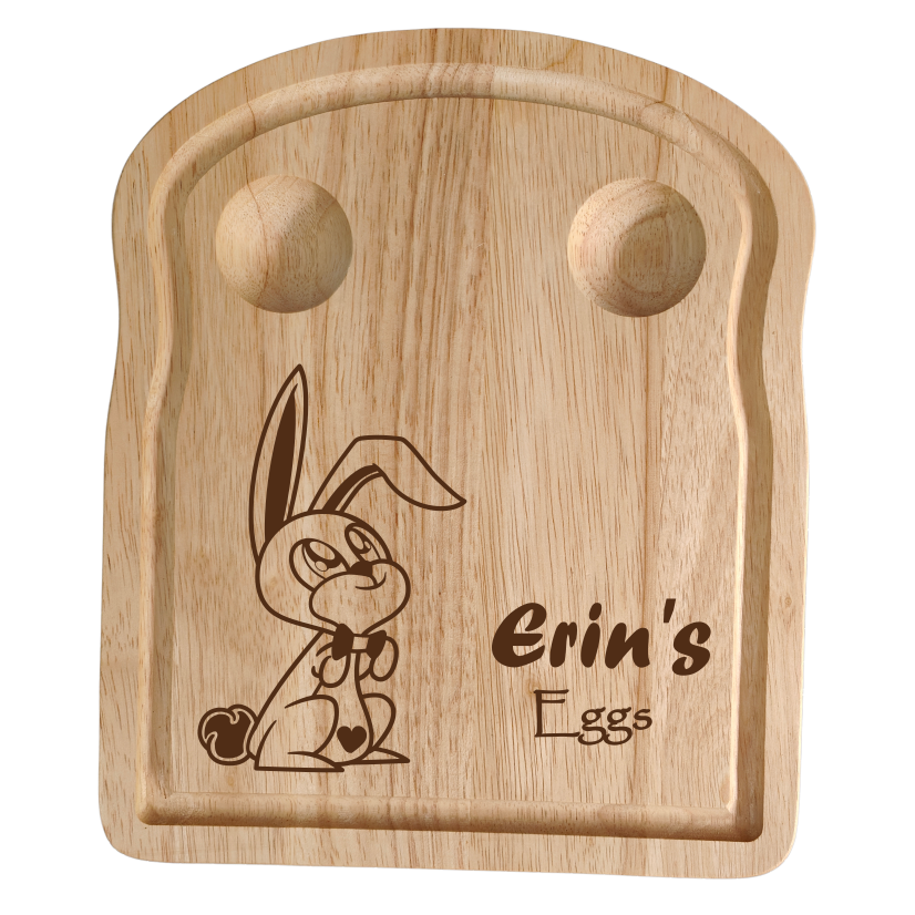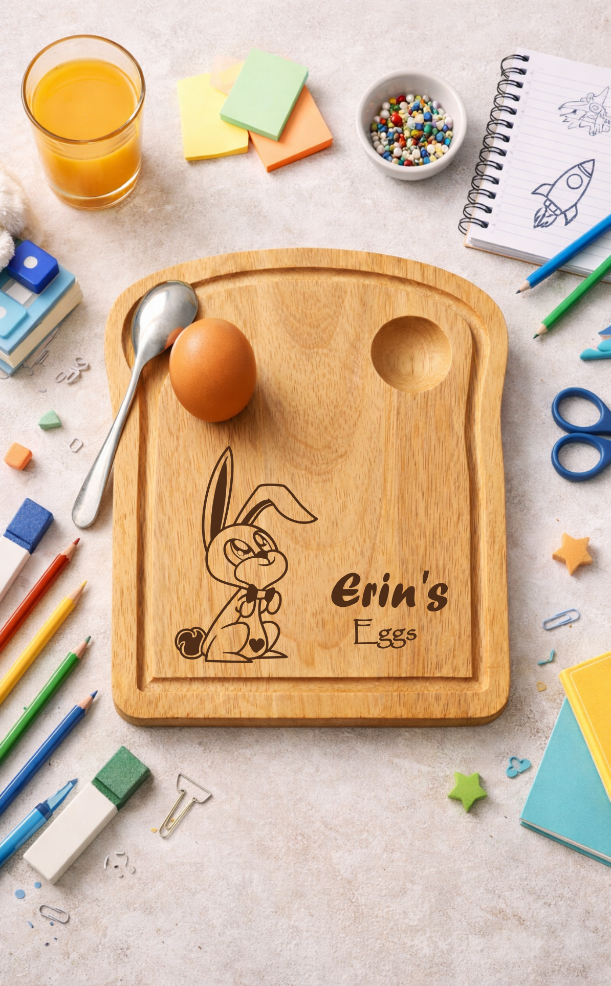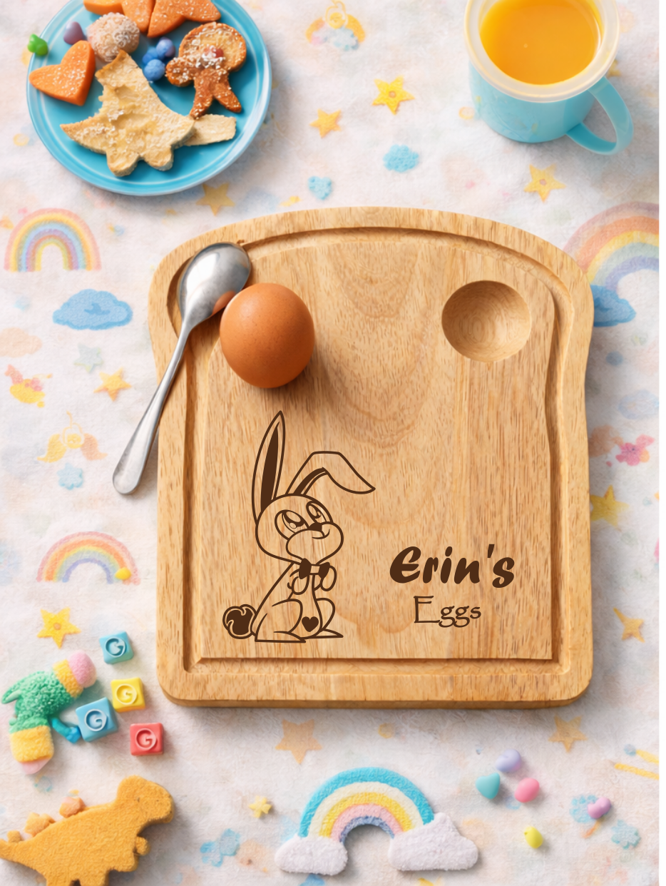 Make breakfast magical with this adorable personalised wooden egg board featuring a charming Easter Bunny design and your child’s name! Handcrafted for style and functionality, this custom dippy egg holder is perfect for little ones who love their boiled eggs and soldiers.