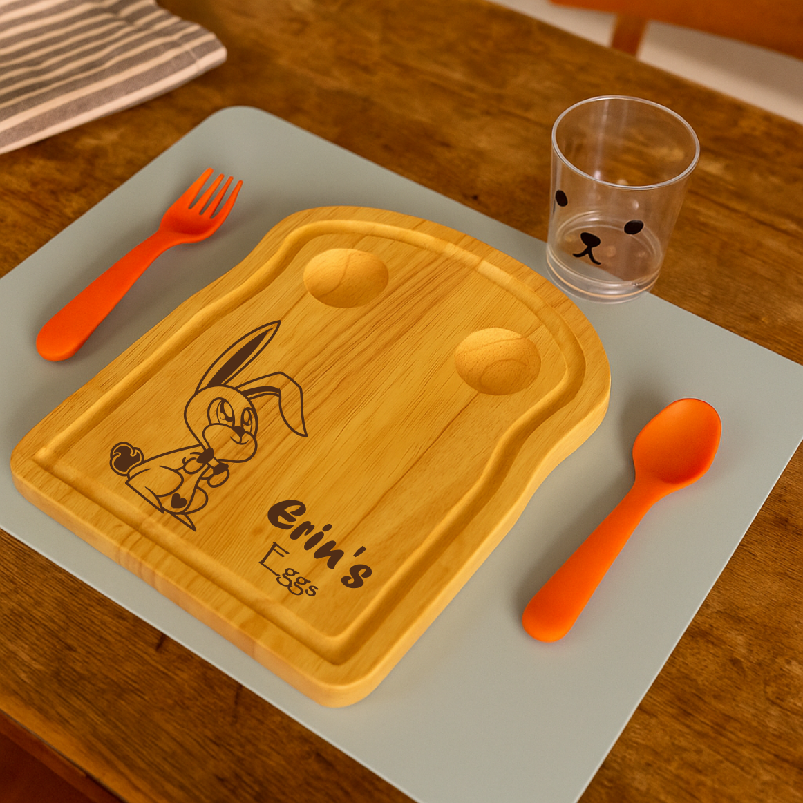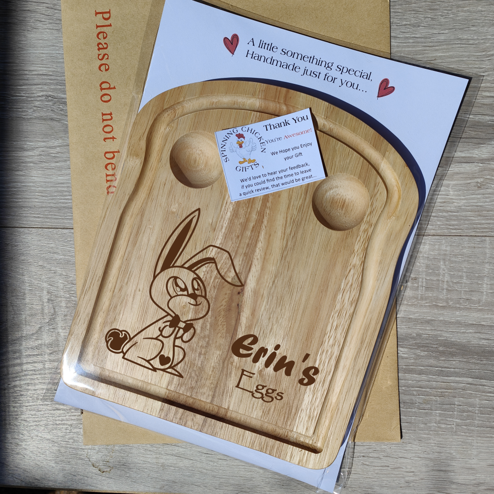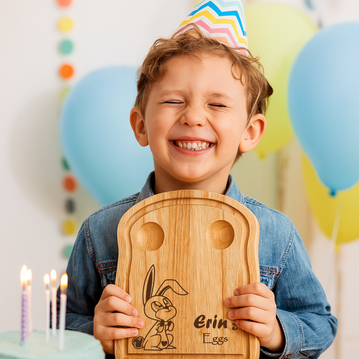 Make breakfast magical with this adorable personalised wooden egg board featuring a charming Easter Bunny design and your child’s name! Handcrafted for style and functionality, this custom dippy egg holder is perfect for little ones who love their boiled eggs and soldiers.