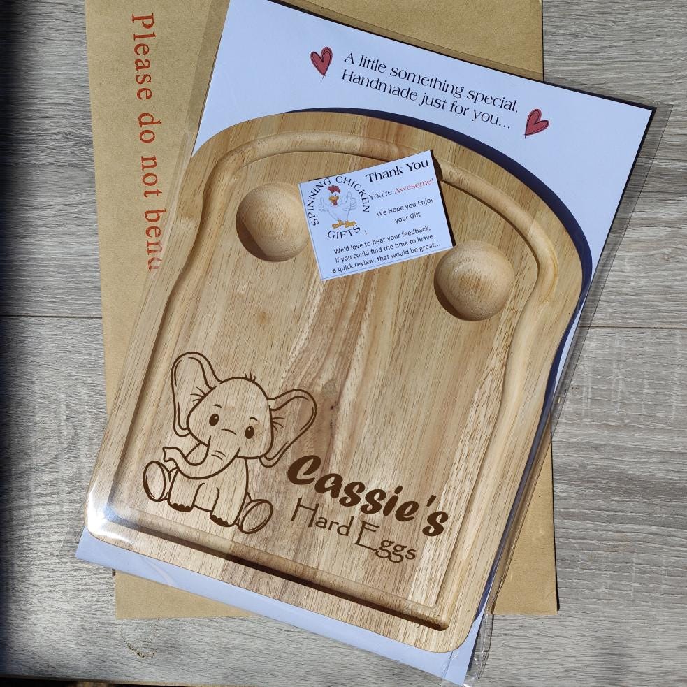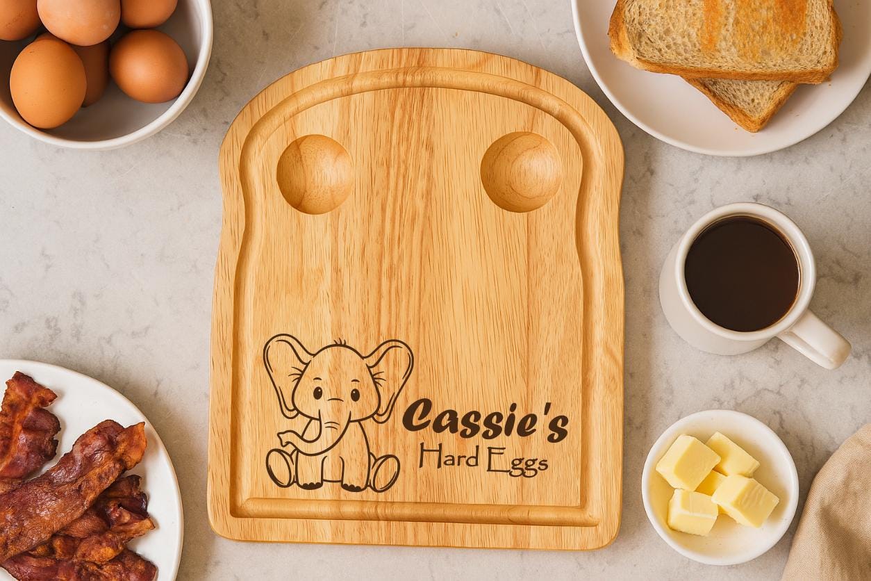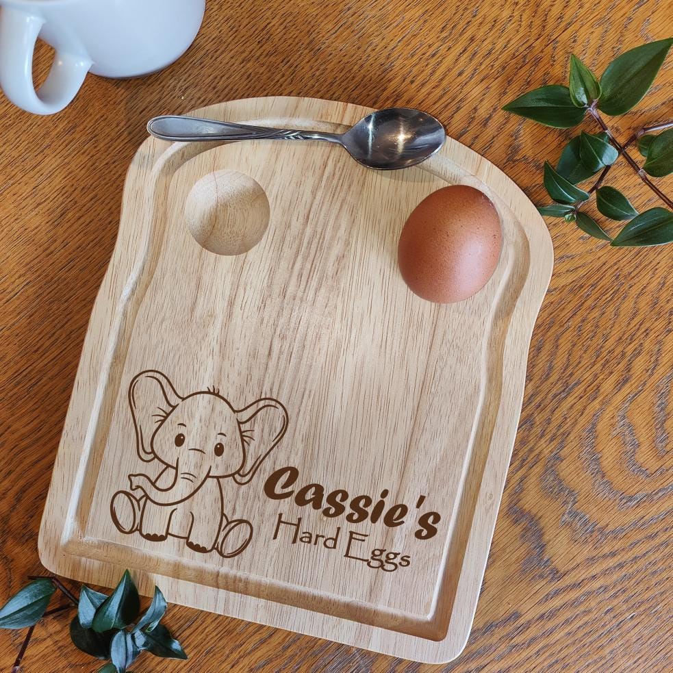 Make breakfast magical with this adorable personalised wooden egg board featuring a charming Elephant design and your child’s name! Handcrafted for style and functionality, this custom dippy egg holder is perfect for little ones who love their boiled eggs and soldiers.